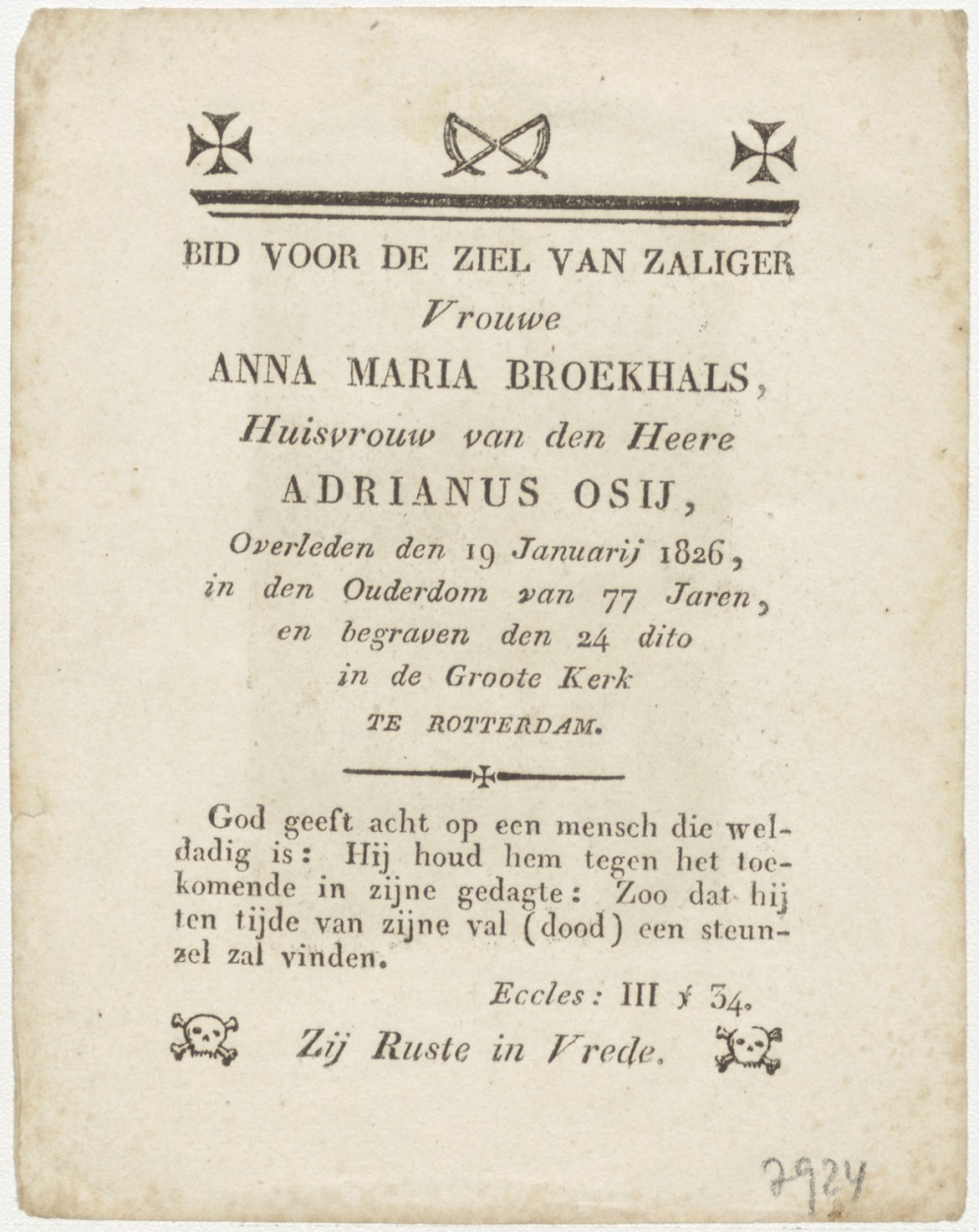 Verrijzenis van Christus, kz. kz. Bid voor ziel Anna Maria Broekhals (+1826) Rotterdam, huisvrouw van Adrianus Osij