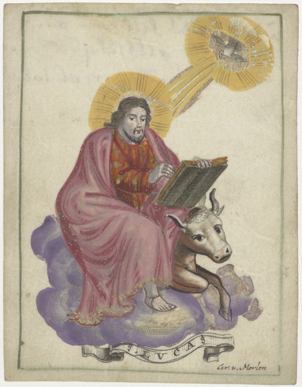 H. Lucas de evangelist, ingekleurd, kz. Religieus;bid voor ziel Anna Schijven(?) (+1699), geestelijk dogter