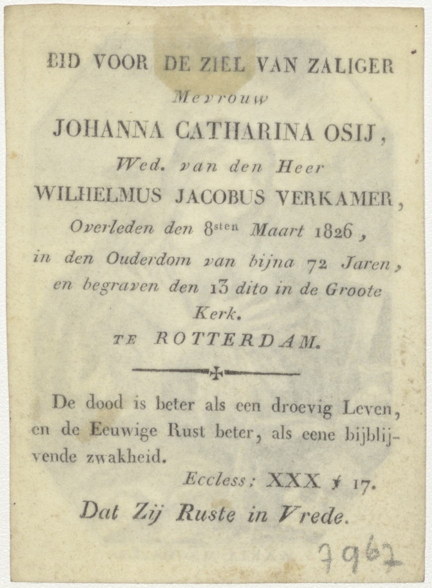 H. Maria Magdalena, kz. Bid voor ziel Johanna Catharina Osij (+1826) Rotterdam, weduwe van Wilhelmus Jacobus Verkamer