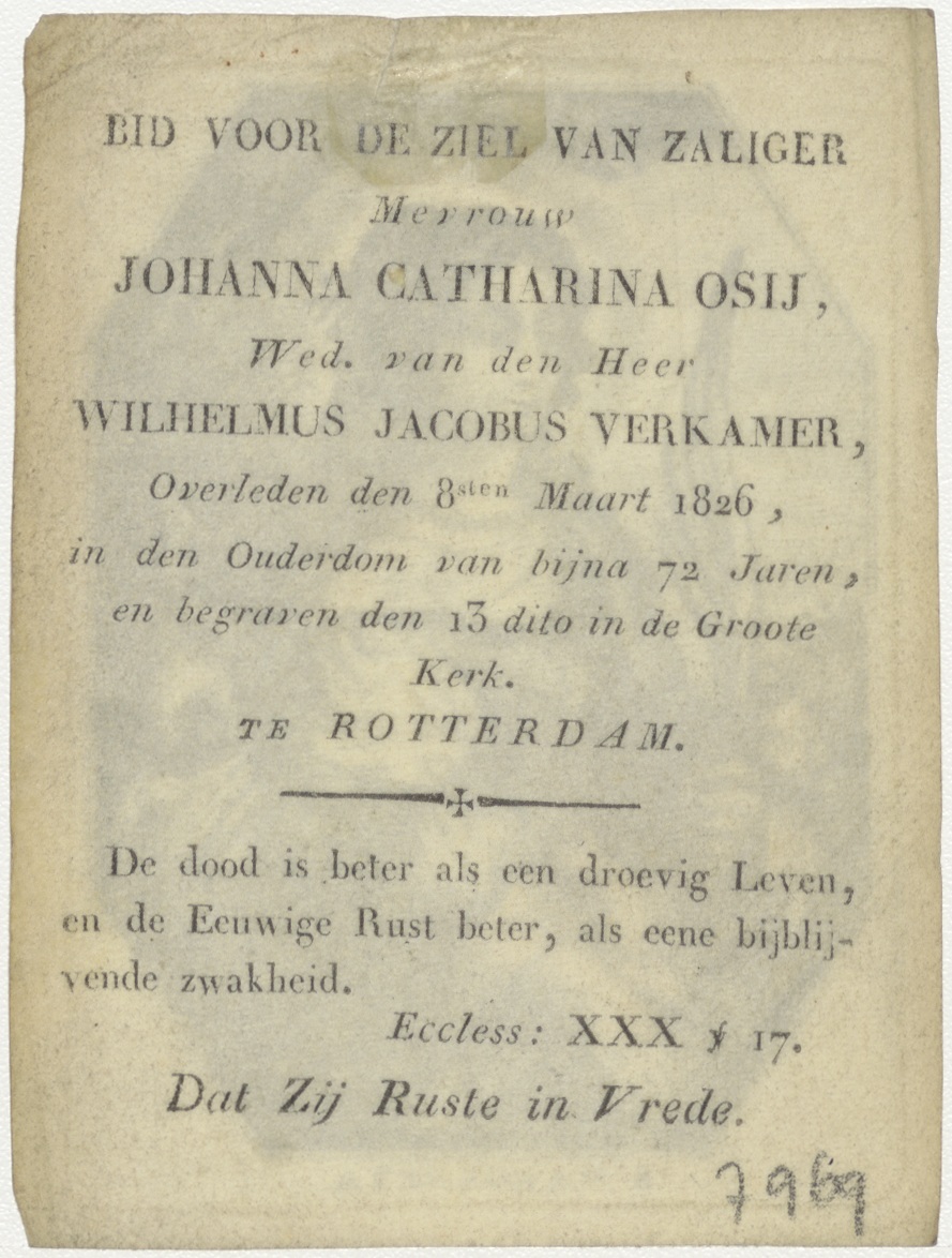 H. Margaretha, kz. Bid voor ziel Johanna Catharina Osij (+1826) Rotterdam, weduwe van Wilhelmus Jacobus Verkamer