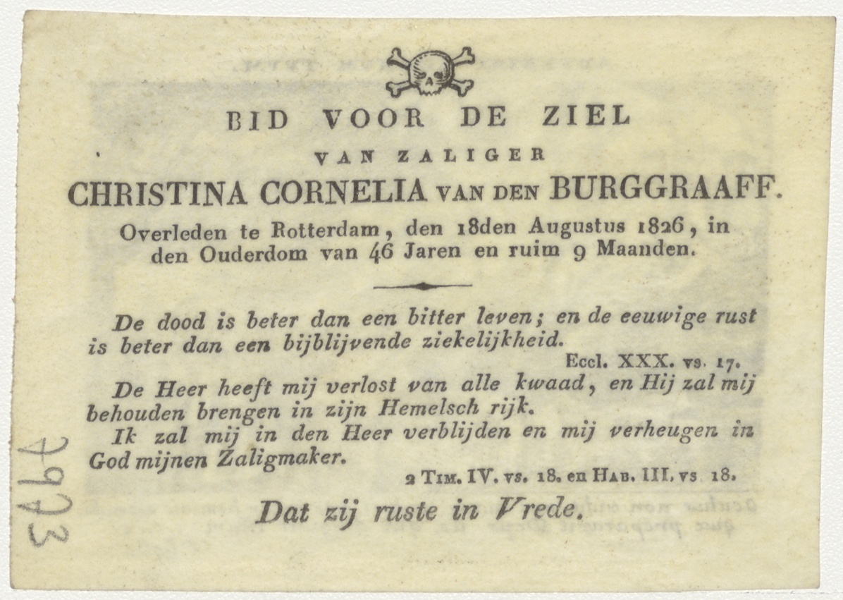 Onze Vader, die in de hemelel zijt..., kz. Bid voor ziel Van den Burggraaff (+1826) Rotterdam