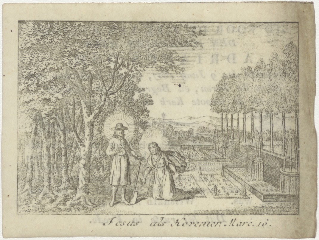 Christus als hovenier met Maria Magdalena, kz. Bid voor ziel Adrianus Osij (+1827) Rotterdam