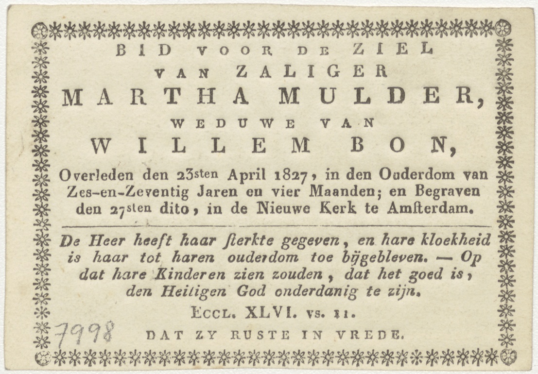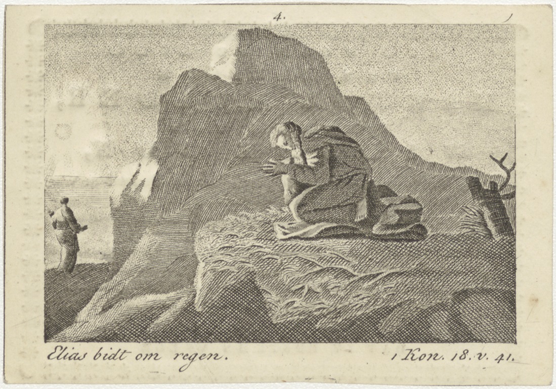 Elias bidt om regen (1 Kon.18:41), kz. Bid voor ziel Martha Mulder (+1827) Amsterdam, weduwe van Willem Bon