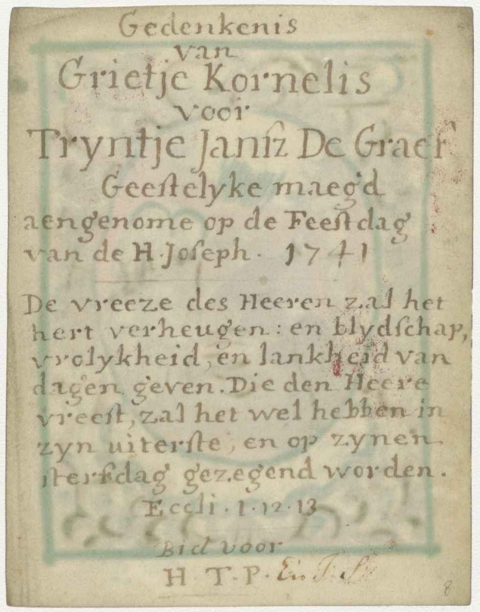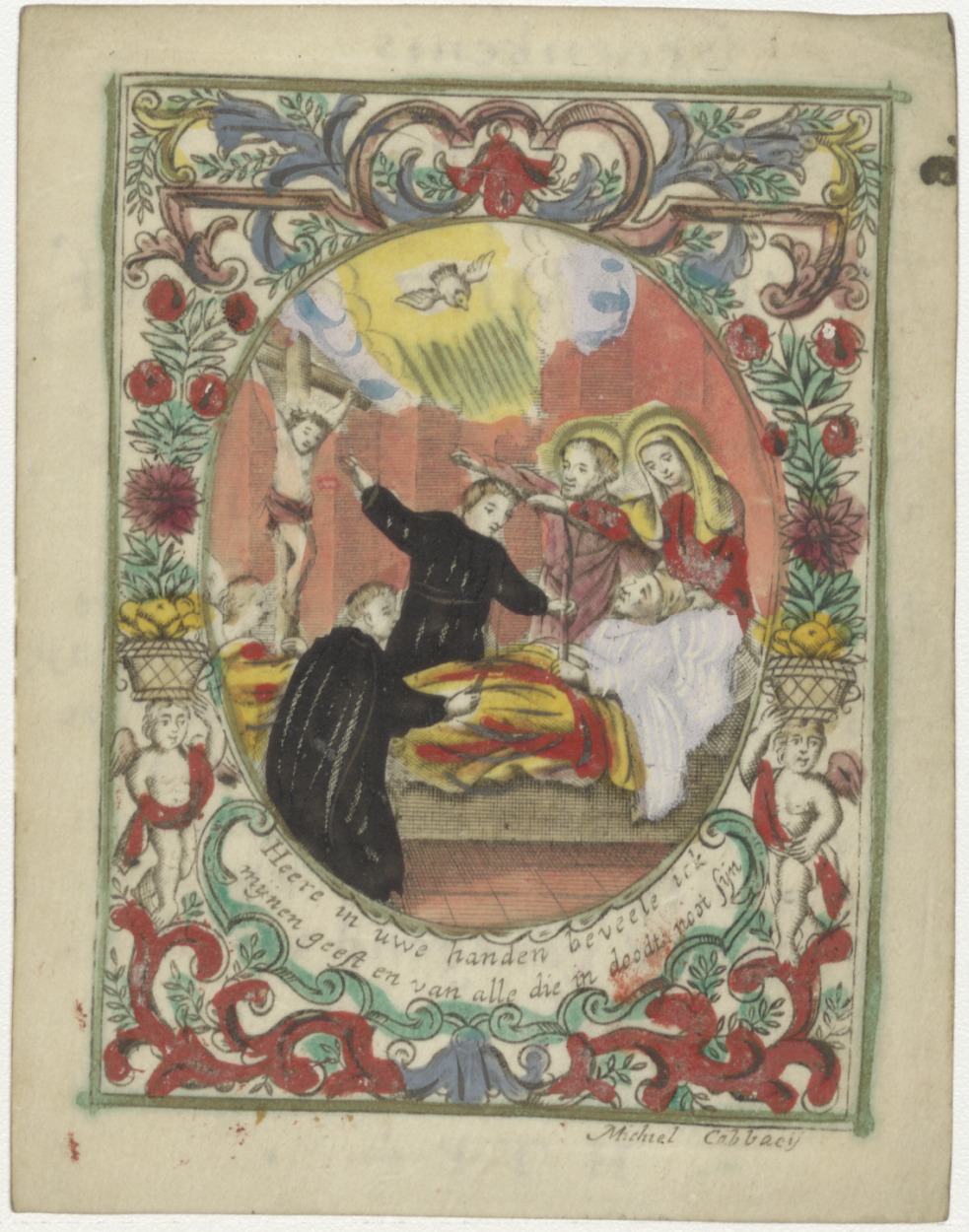 Sterfbed van een man, met randversiering, ingekleurd, kz. Religieus; van Grietje Kornelis voor Trijntje Jansz de Graef, aangenomen geestelijk maegd, 1741, Bid voor H.T.P. en J.S.