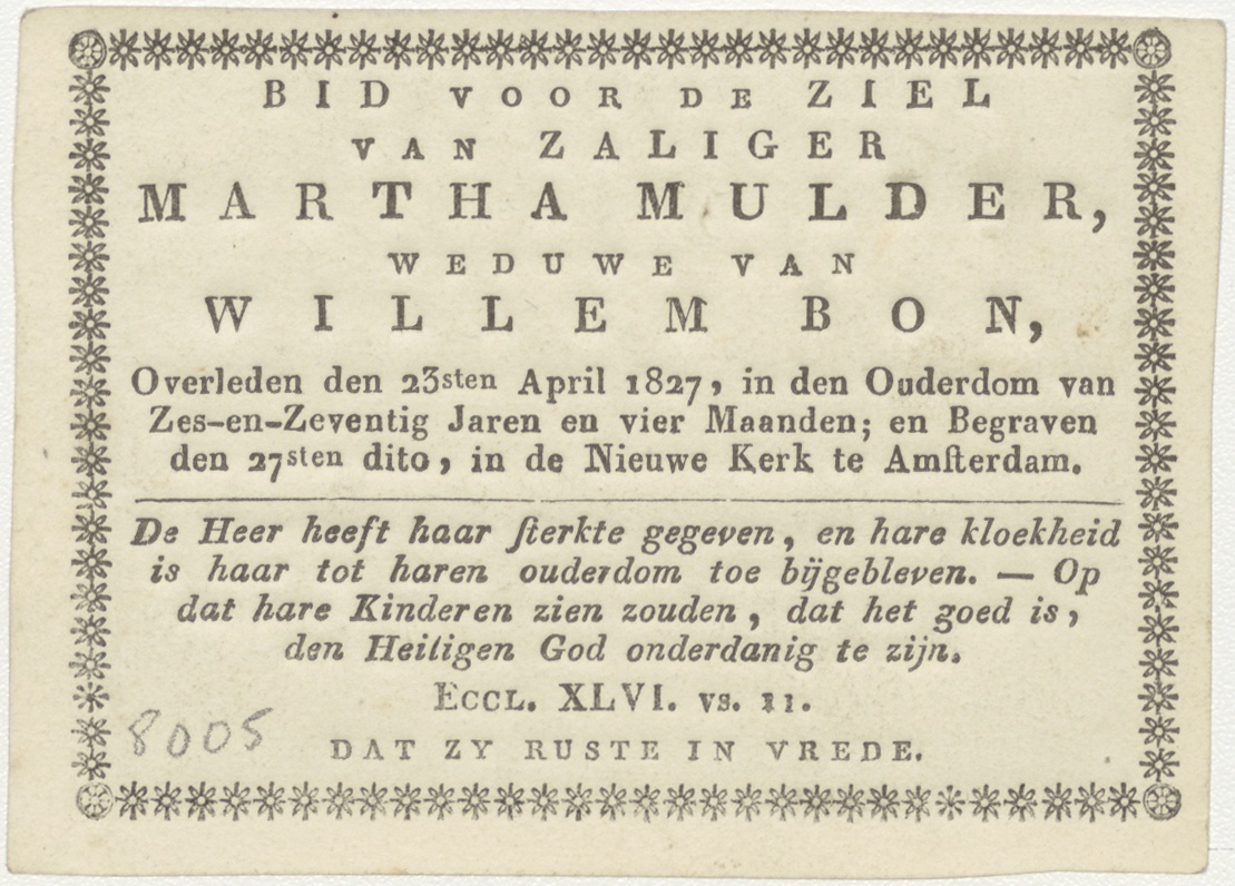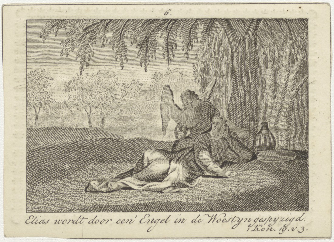 Elias wordt door een engel in de woestijn gespijzigd (1 Kon. 19:3), kz. Bid voor ziel Martha Mulder (+1827) Amsterdam, weduwe van Willem Bon