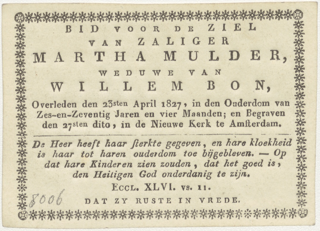Dood van Abel (Gen.4:8), kz. Bid voor ziel Martha Mulder (+1827) Amsterdam, weduwe van Willem Bon