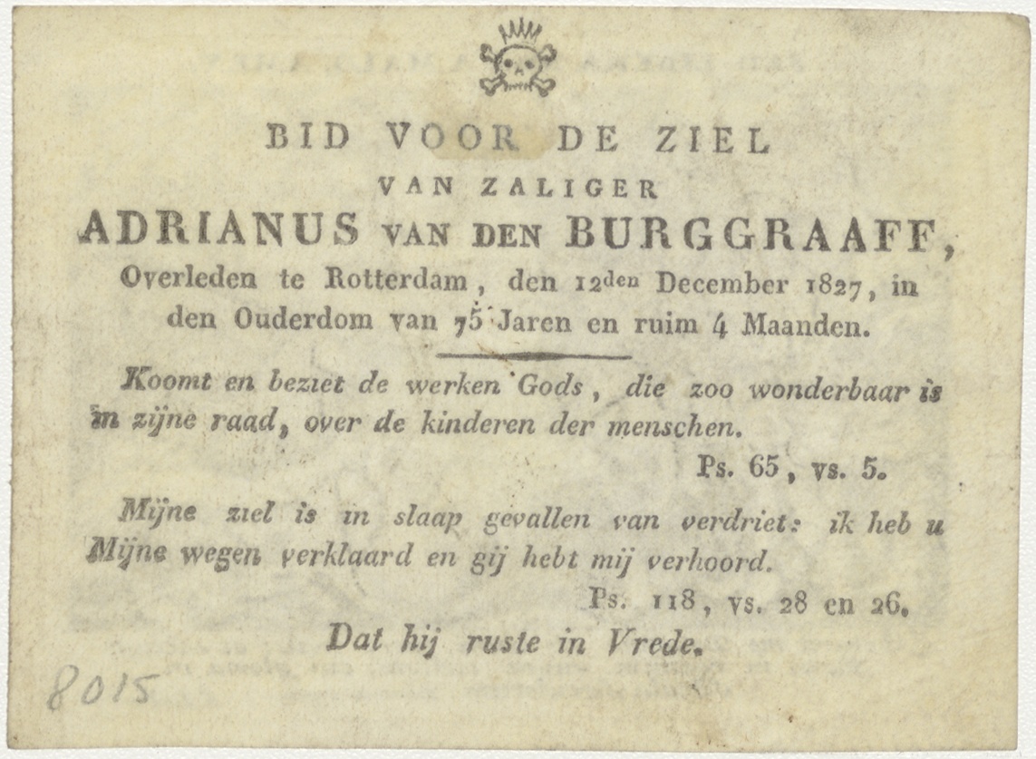 Lijdt ons niet in bekoring... Onze Vader, kz. Bid voor ziel Van den Burggraaff (+1827) Rotterdam
