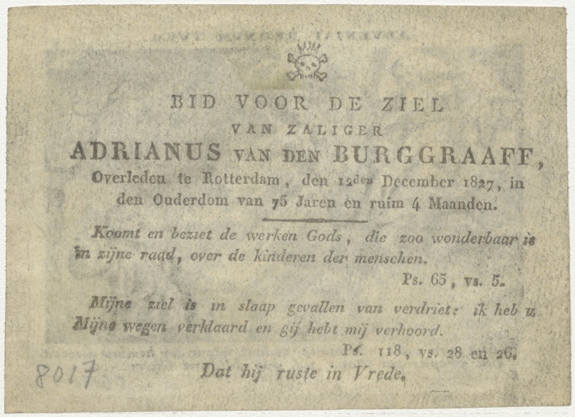 Onze Vader die in de hemel zijt, kz. Bid voor ziel Van den Burggraaff (+1827) Rotterdam
