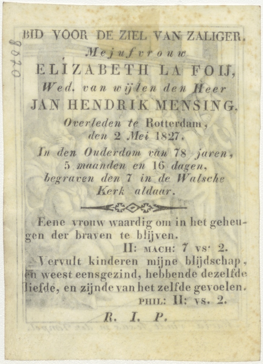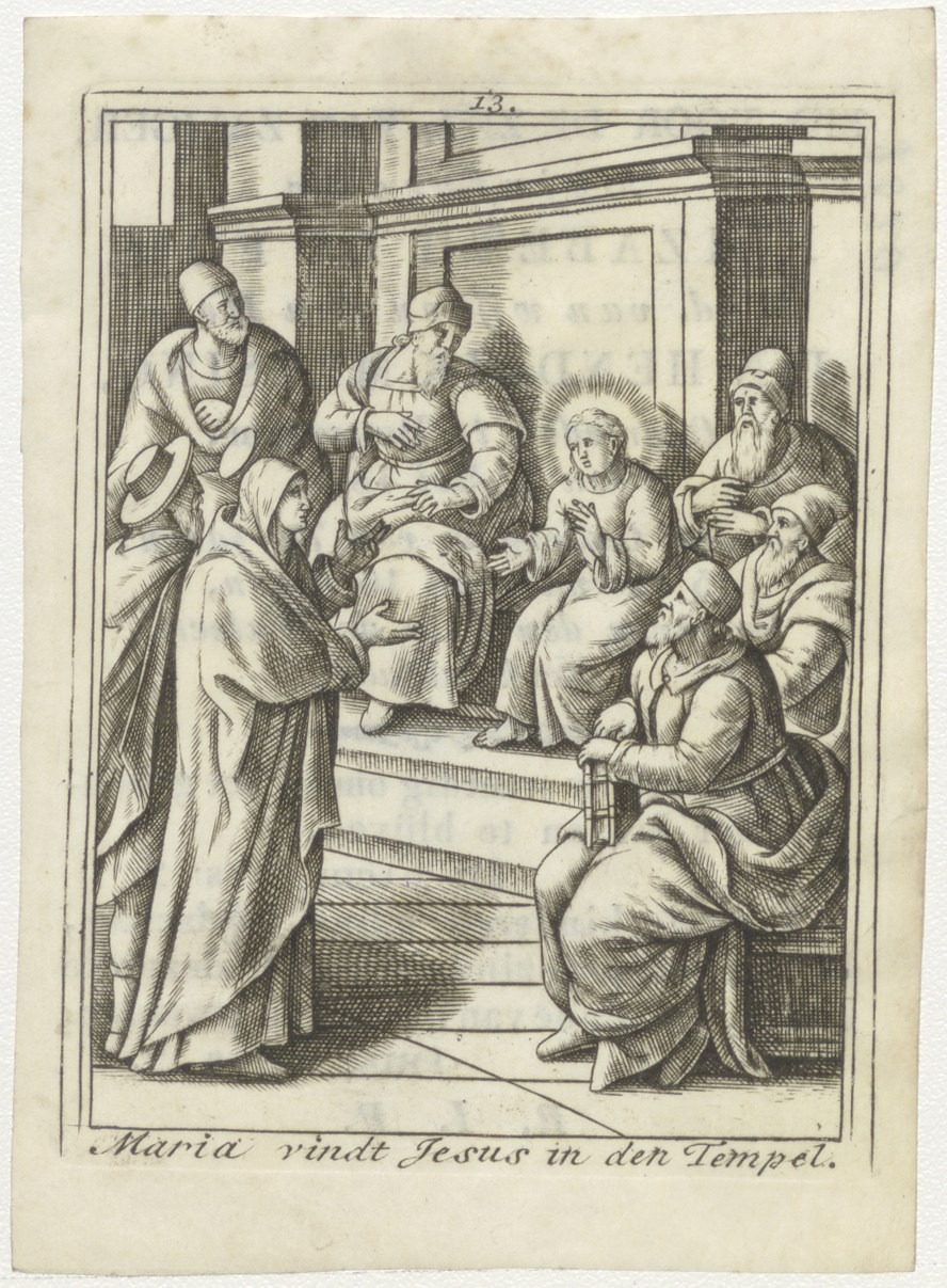 Het leven der Heilige Maagd Maria (serie): 13. Maria vindt Christus in de tempel, kz. Bid voor ziel Elisabeth la Foy (+1827) Rotterdam, weduwe van Jan Hendrik Mensing