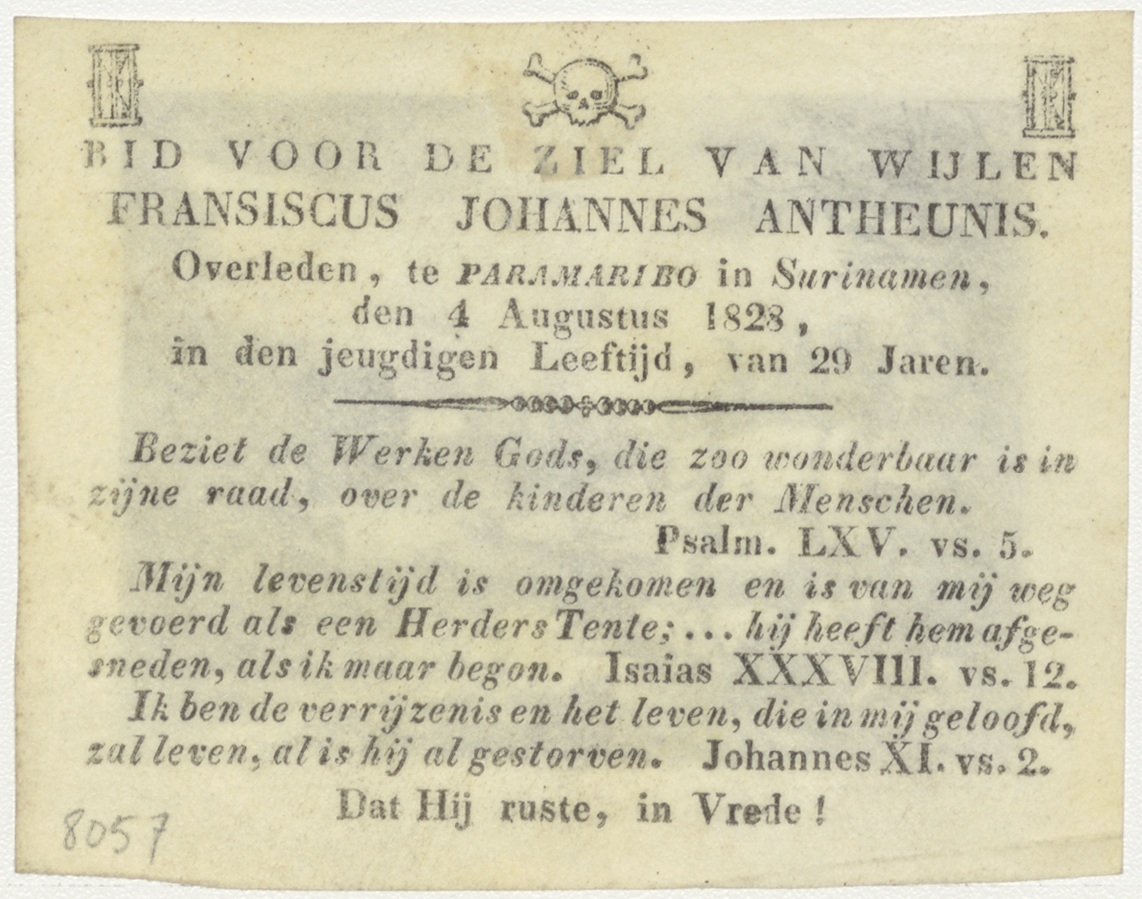 Adam in het paradijs, kz. Bid voor ziel Antheunis (+1828) Paramaribo