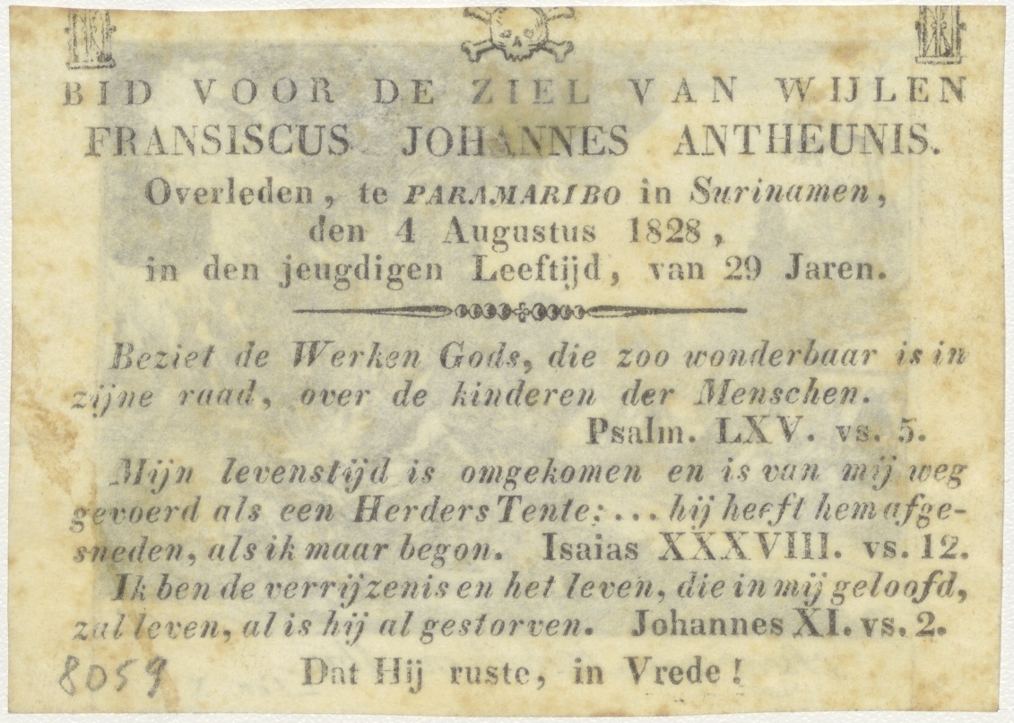 Straf van Nabab en Abiu (Lev. 10), kz. Bid voor ziel Antheunis (+1828) Paramaribo