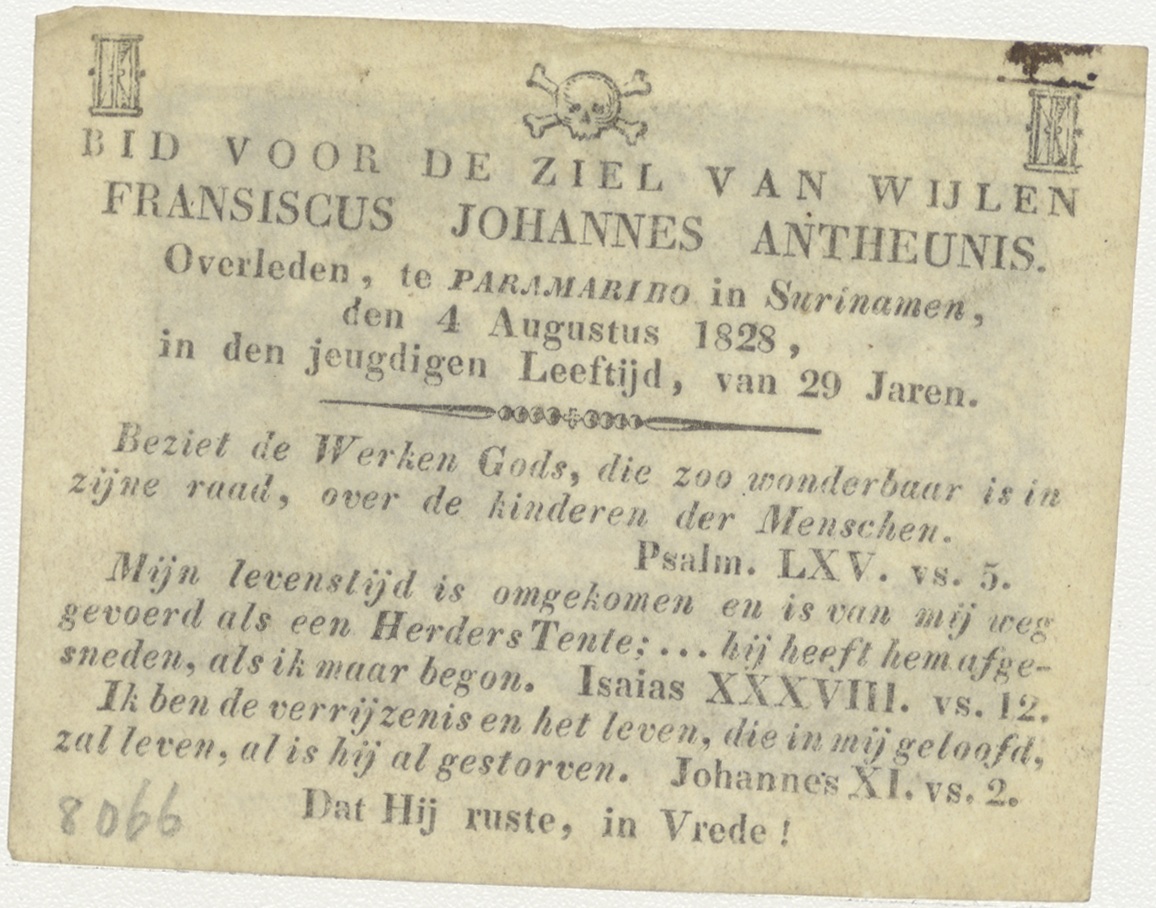 Gezegt van Jacob, droom van ladder naar de hemel (Gen. 28), kz. Bid voor ziel Fransiscus Johannes Antheunis (+1828) Paramaribo Suriname