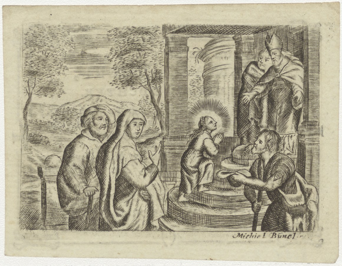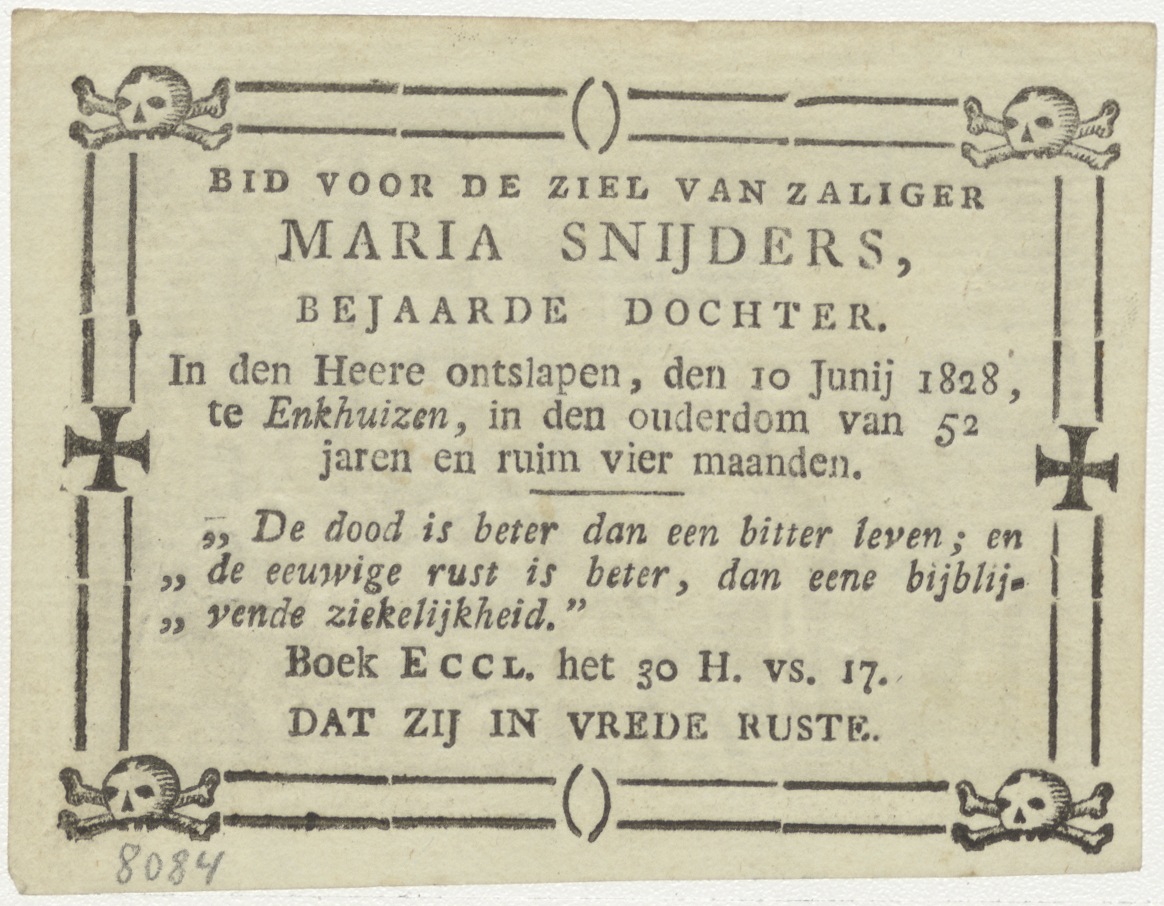 Maria's opdracht in de tempel, kz. Religieus; bid voor ziel Maria Snijders (+1828) bejaarde dochter