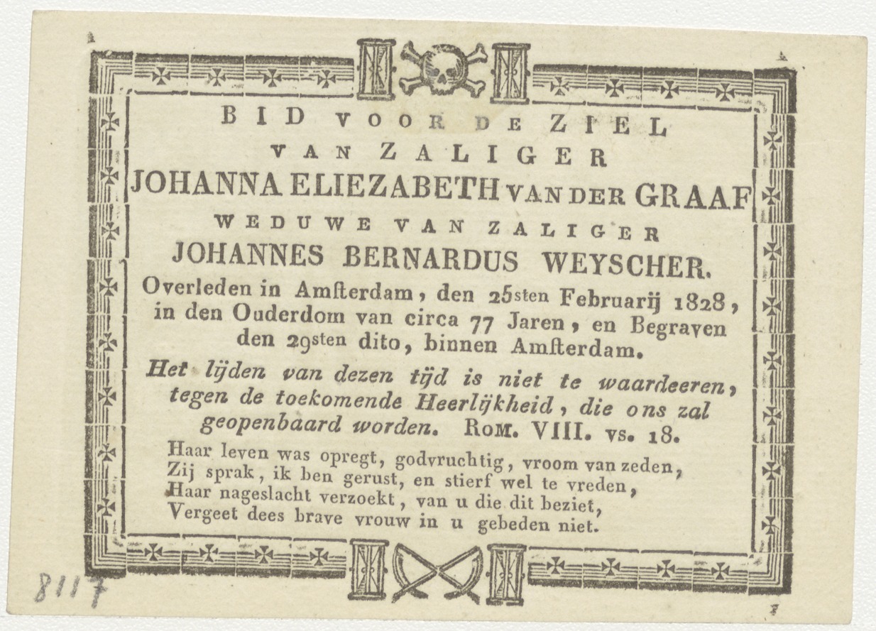 H. Kluizenaar, kz. Bid voor ziel Van der Graaf-Weyscher (+1828) Amsterdam