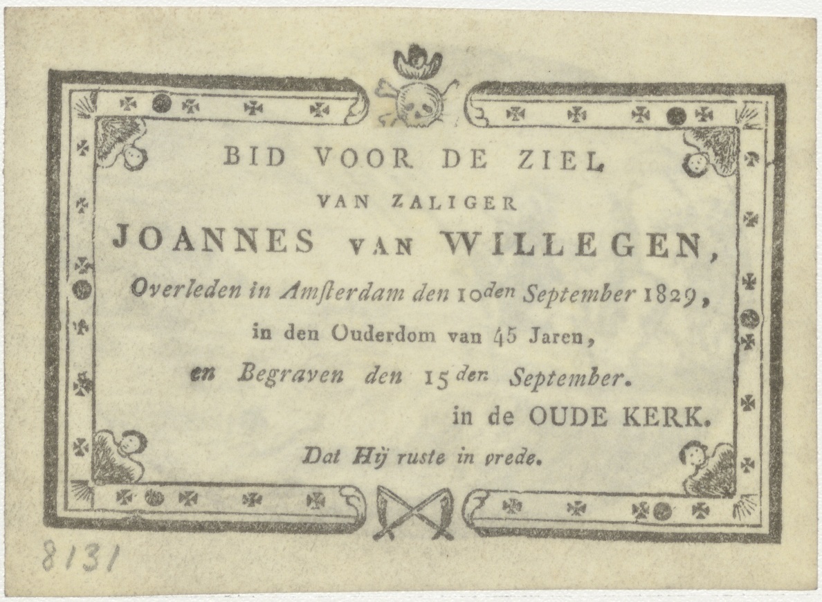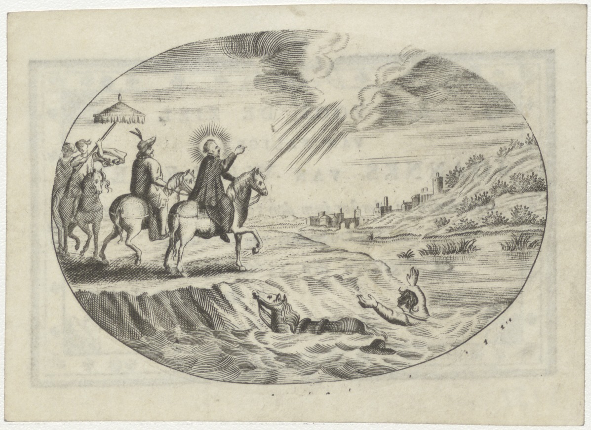 Geestelijke te paard met drenkeling, kz. Bid voor ziel Van Willegen (+1829) Amsterdam
