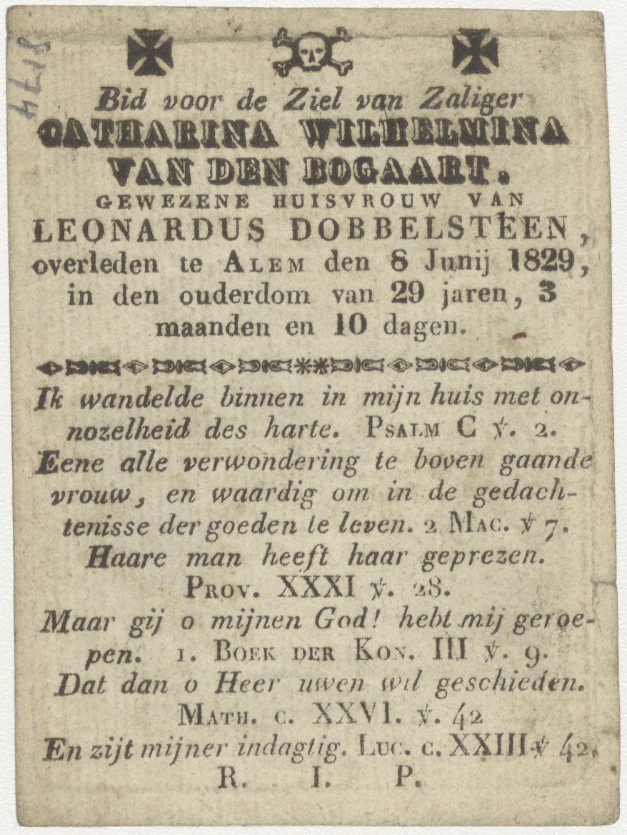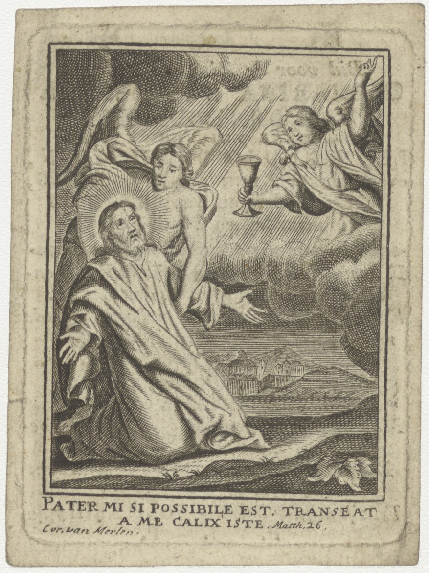Christus ontvangt het H. Sacrament in de tuin van olijven (Math. 26), kz. Bid voor ziel Dobbelsteen-van den Bogaart (+1829) Alem