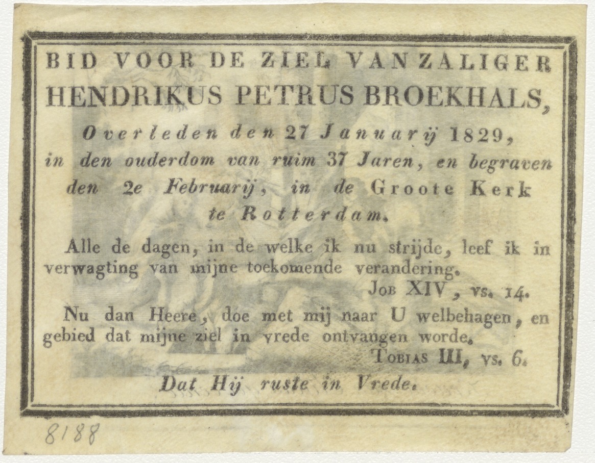 Kracht van Eliseus gebeente, kz. Bid voor ziel Broekhals (+1829) Rotterdam