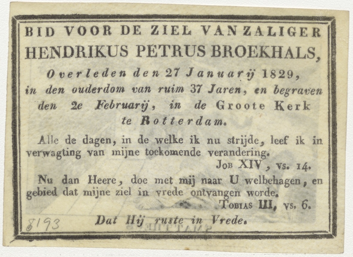 H. Mattheus, kz. Bid voor ziel Broekhals (+1829) Rotterdam