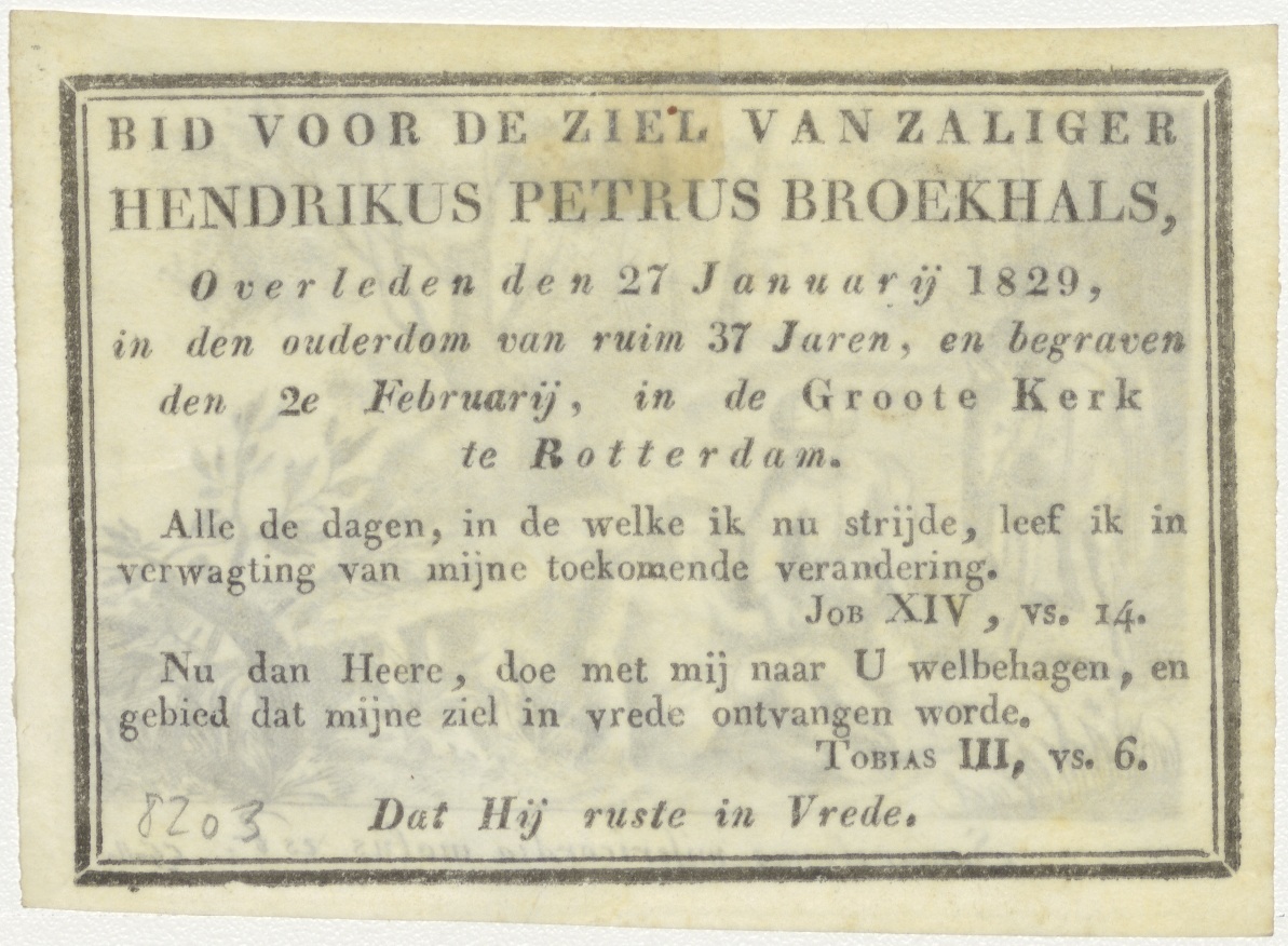 Barmhartige Samaritaan, kz. Bid voor ziel Broekhals (+1829) Rotterdam