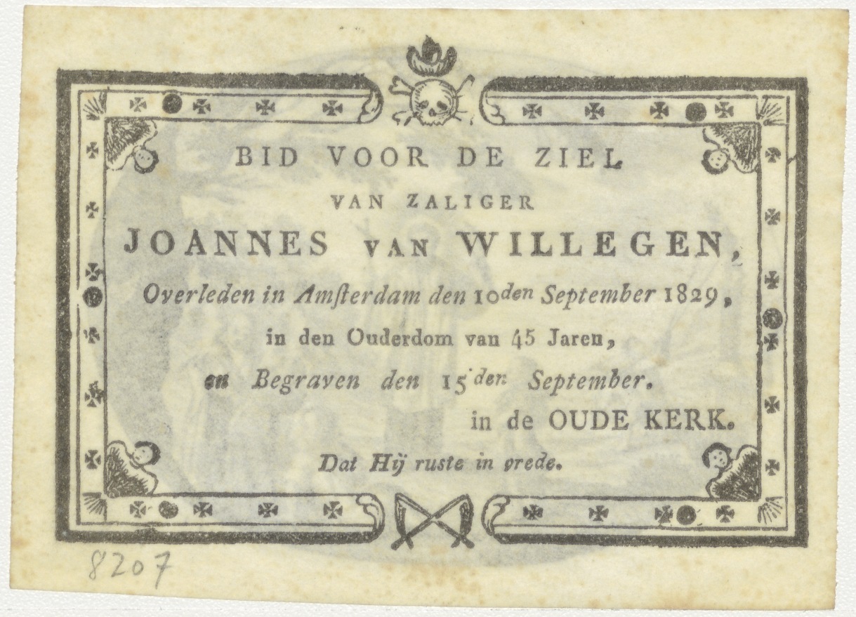 H. Geestelijke in derde wereld, kz. Bid voor ziel Joannes van Willigen (+1829) Amsterdam