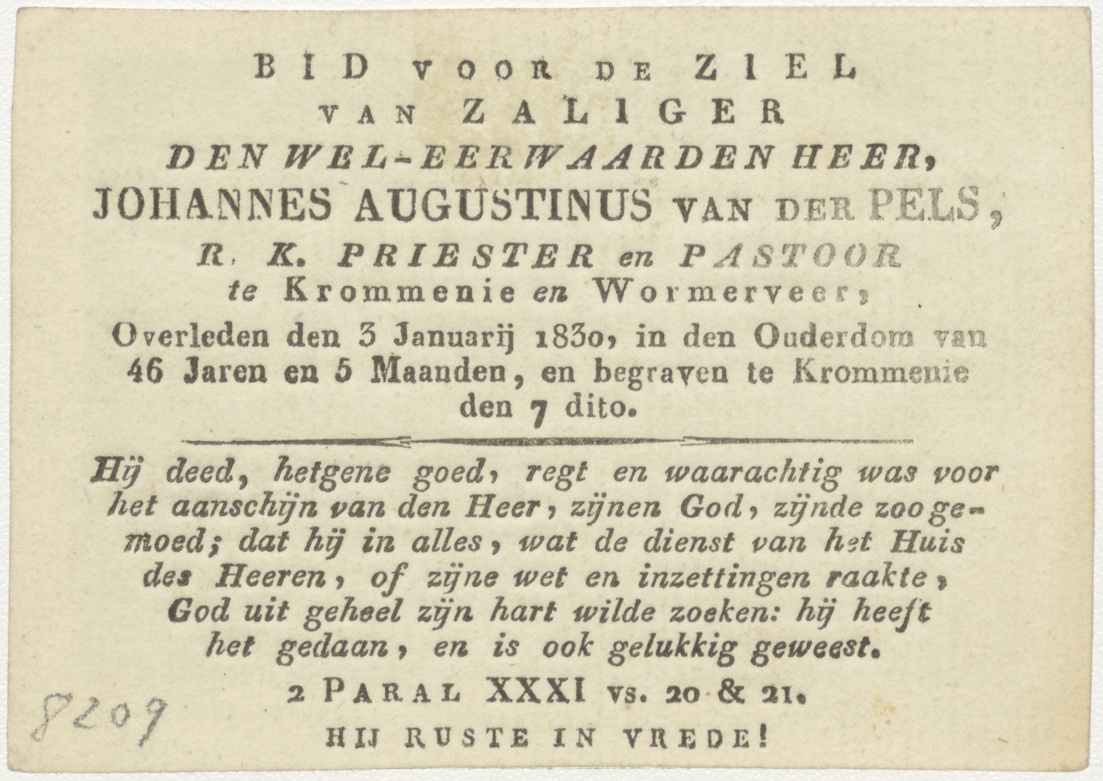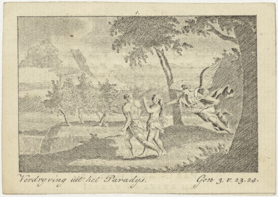 Verdrijving uit het paradijs (Gen.3), kz. Religieus; bid voor ziel Johannes Augustinus van der Pels (+1830) Krommenie, pastoor te Krommenie, Wormerveer