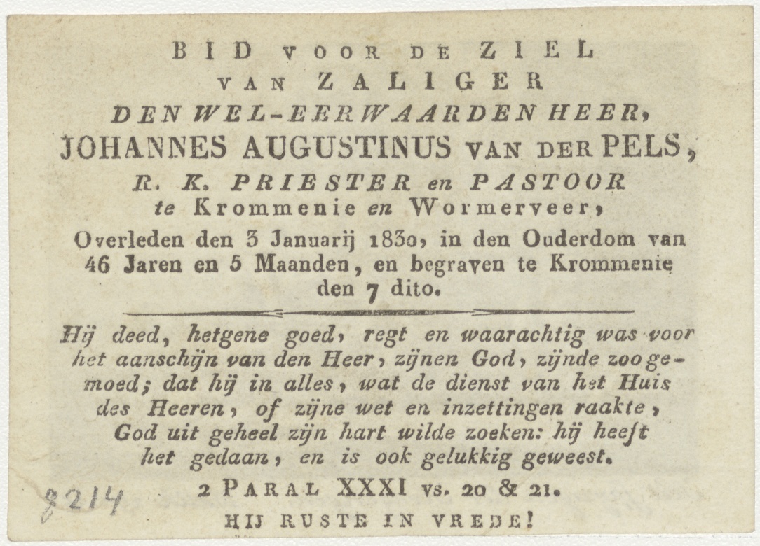 Spijzingen der hongerigen (Math.25:35), kz. Religieus; bid voor ziel Johannes Augustinus van der Pels (+1830) Krommenie, pastoor te Krommenie, Wormerveer