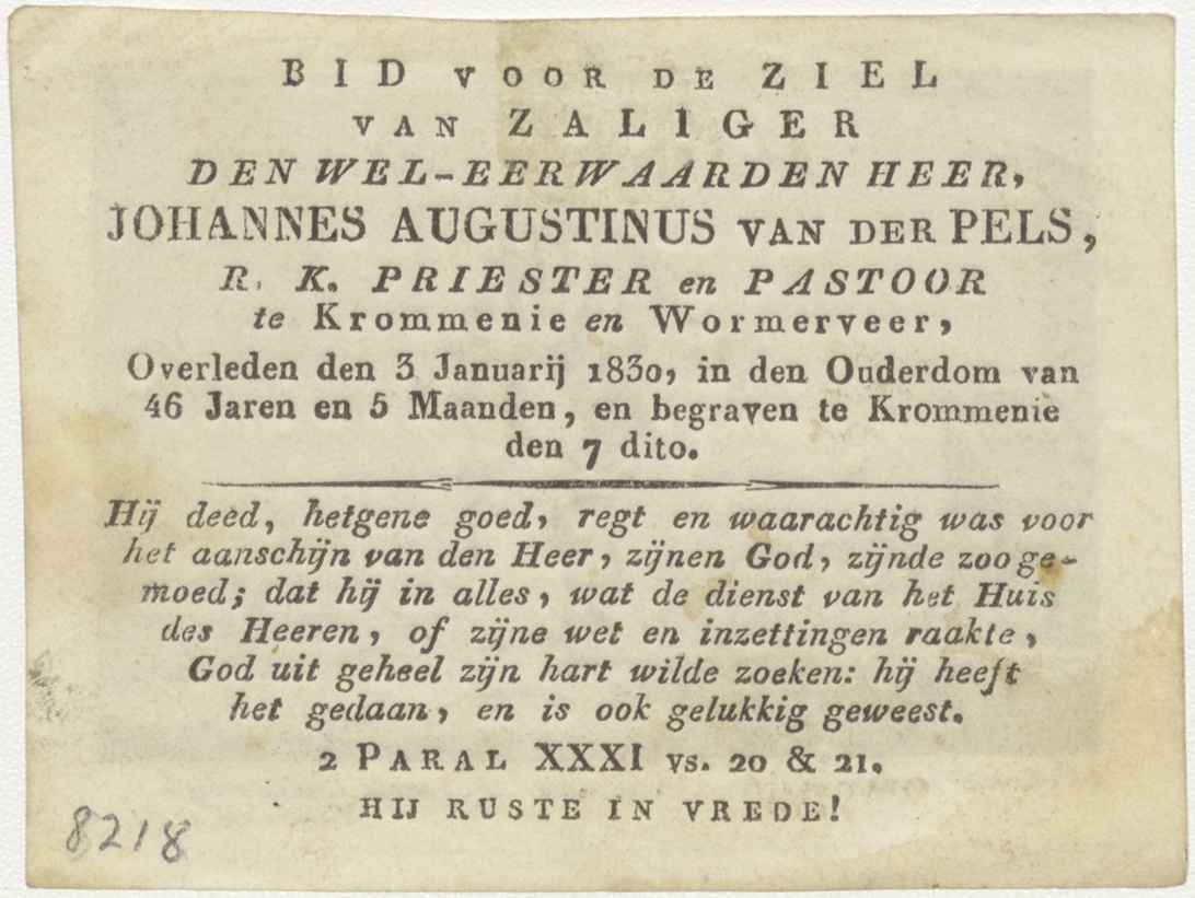 Petrus naar buiten gaande weende bitterlijk (Math. 16:75), kz. Religieus; bid voor ziel Johannes Augustinus van der Pels (+1830) Krommenie, pastoor te Krommenie, Wormerveer