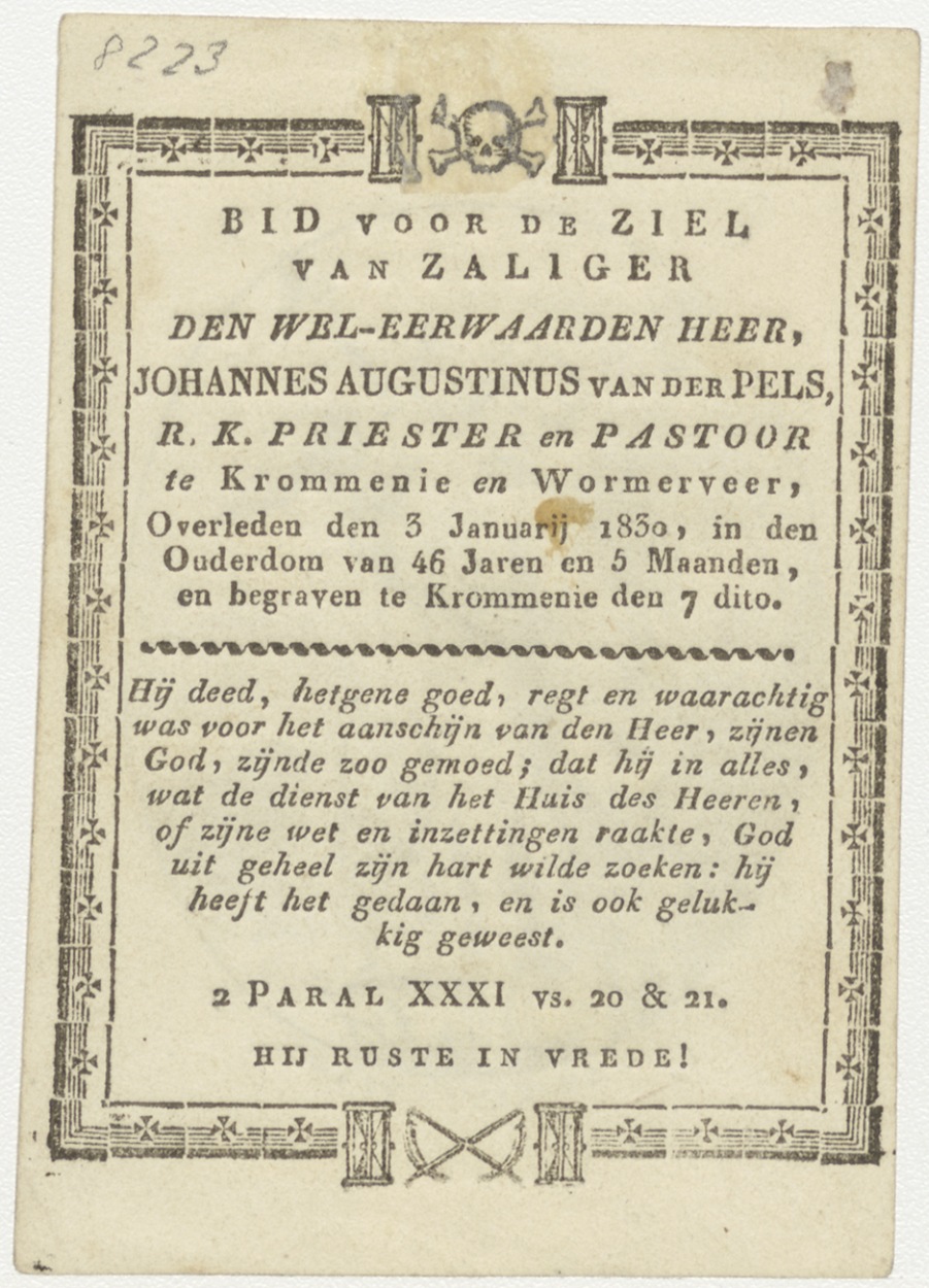 H. Angelus Custos, H. Bewaarengel, kz. Religieus; bid voor ziel Johannes Augustinus van der Pels (+1830) Krommenie, pastoor te Krommenie, Wormerveer