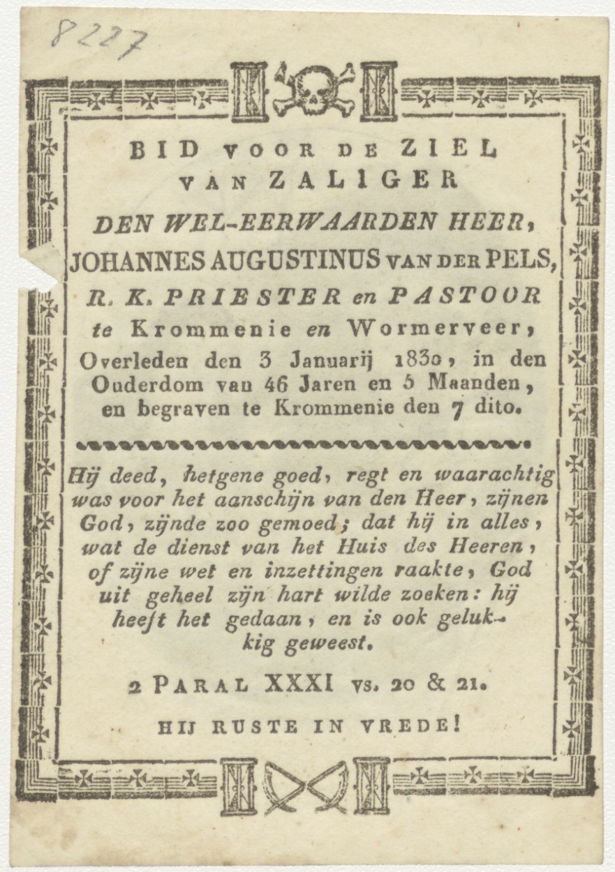 Geboorte van Christus, kz. Religieus; bid voor ziel Johannes Augustinus van der Pels (+1830) Krommenie, pastoor te Krommenie, Wormerveer