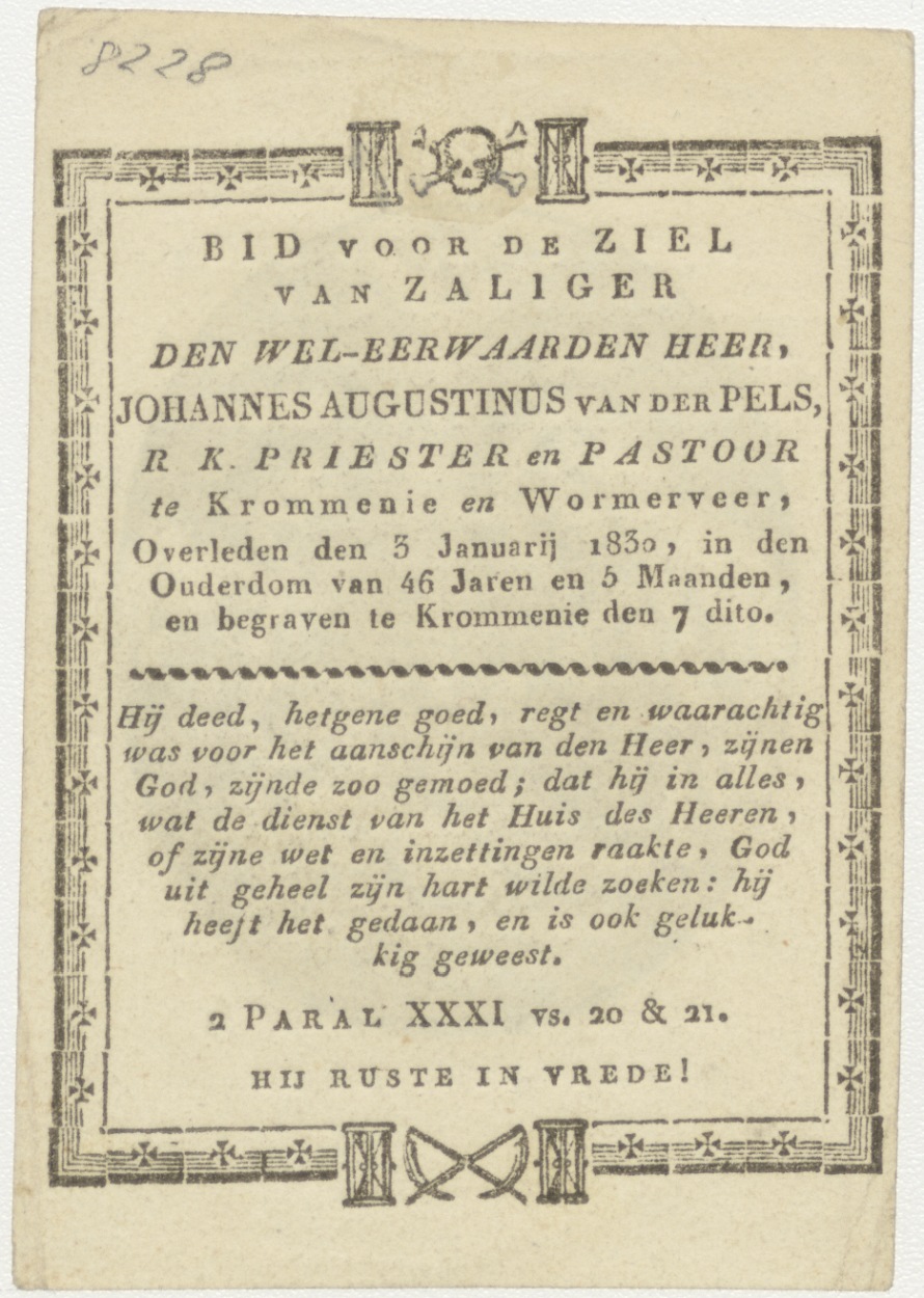 Geboorte van Christus, kind met martelwerktuigen, kz. Religieus; bid voor ziel Johannes Augustinus van der Pels (+1830) Krommenie, pastoor te Krommenie, Wormerveer