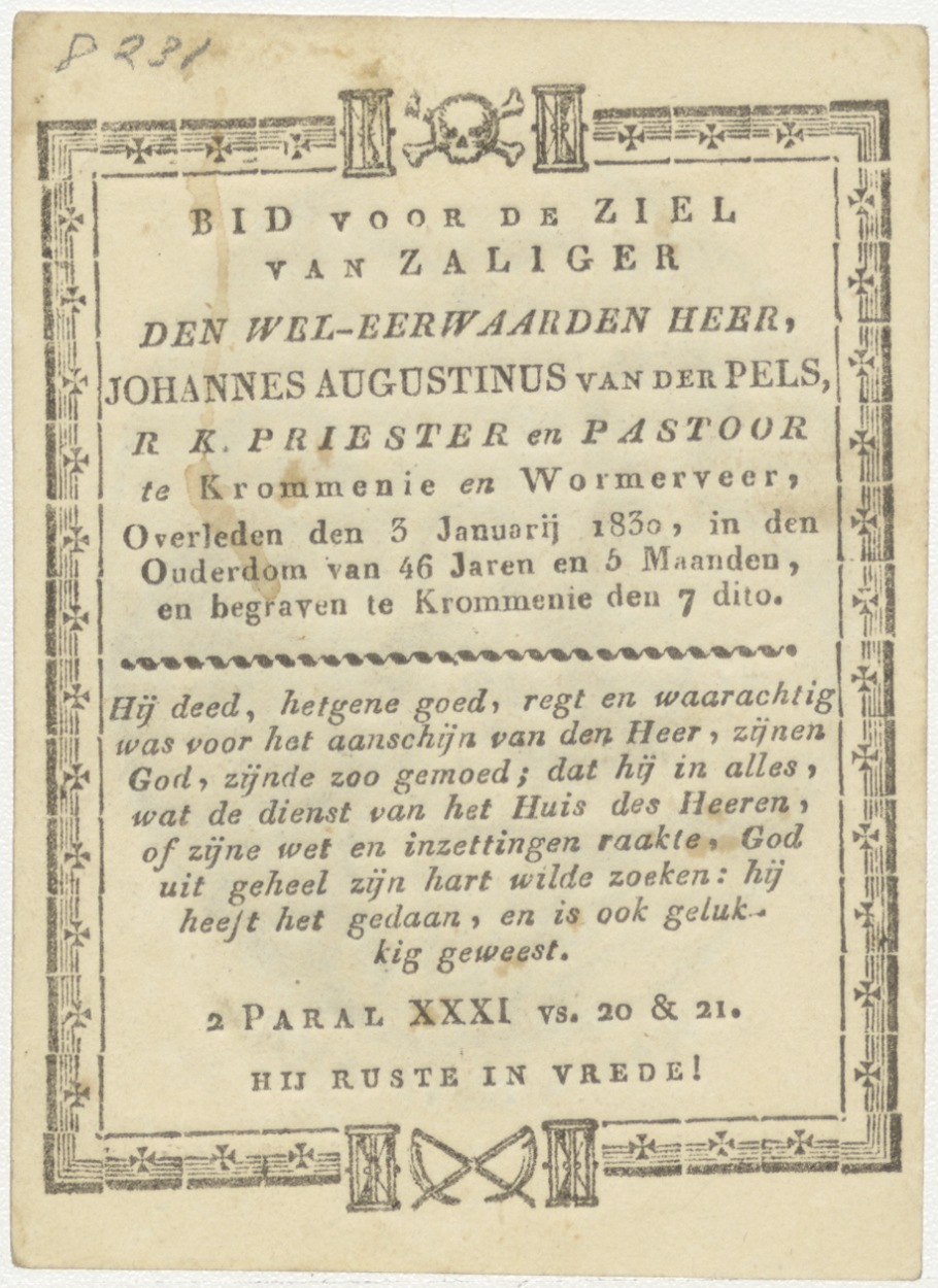 Anna te drieen, kz. Religieus; bid voor ziel Johannes Augustinus van der Pels (+1830) Krommenie, pastoor te Krommenie, Wormerveer