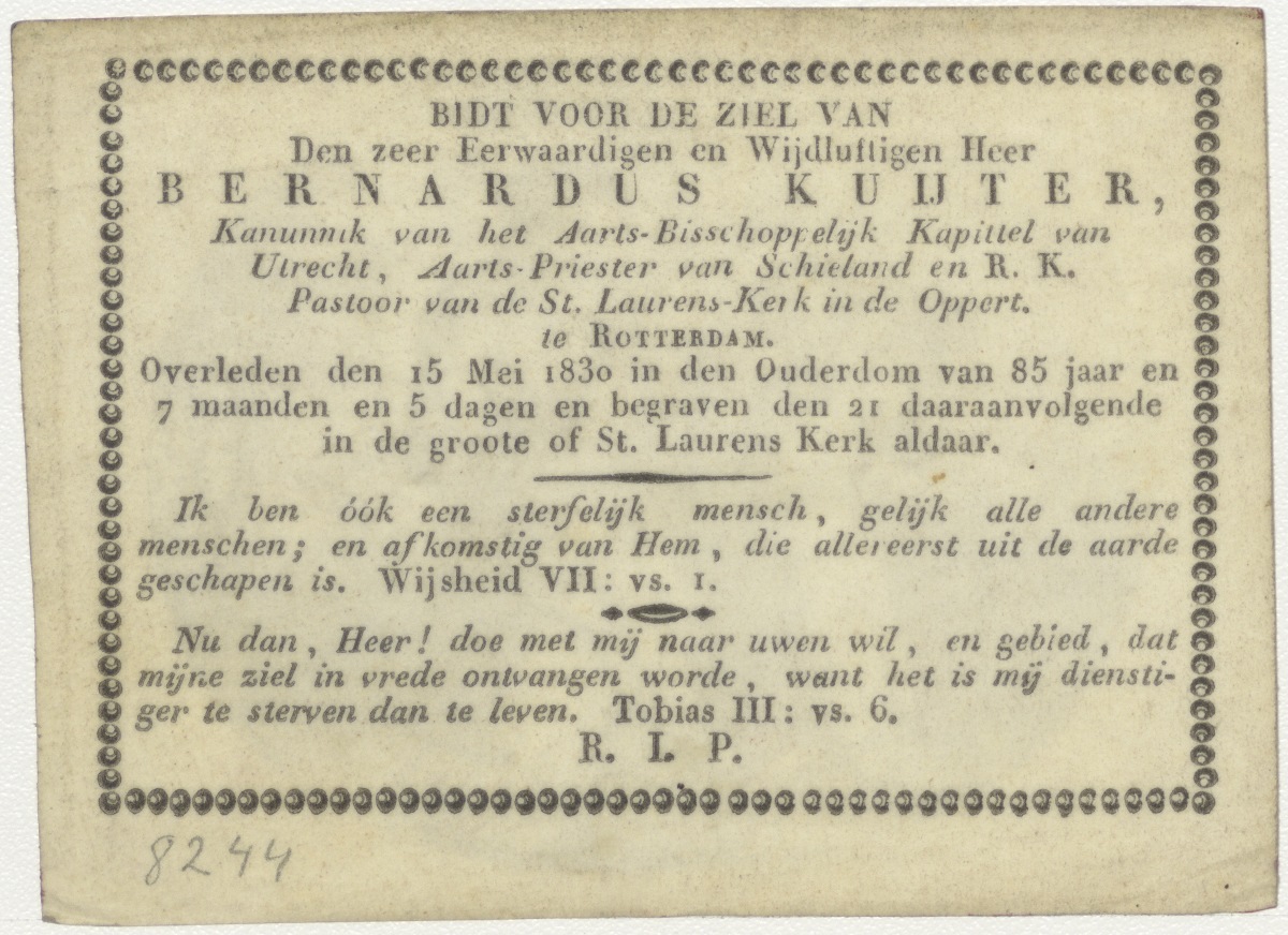 Maria met Christuskind, kz. Religieus; bid voor ziel Bernardus Kuijter (+1830) pastoor St. Laurens de Oppert, Rotterdam