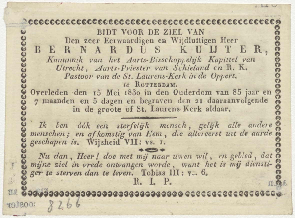 Amor divinus en Anima, kz. Religieus; bid voor ziel Bernardus Kuijter (+1830) pastoor St. Laurens de Oppert, Rotterdam