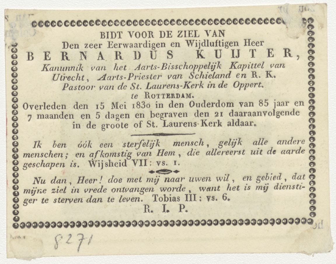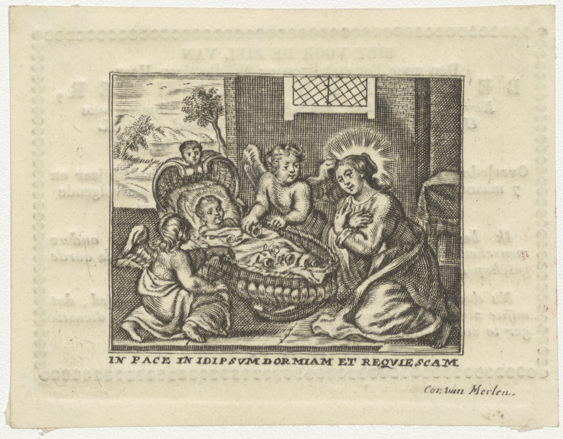 Maria met Christuskind in wieg, kz. Religieus;bid voor ziel Bernardus Kuijter (+1830) pastoor St. Laurens de Oppert, Rotterdam