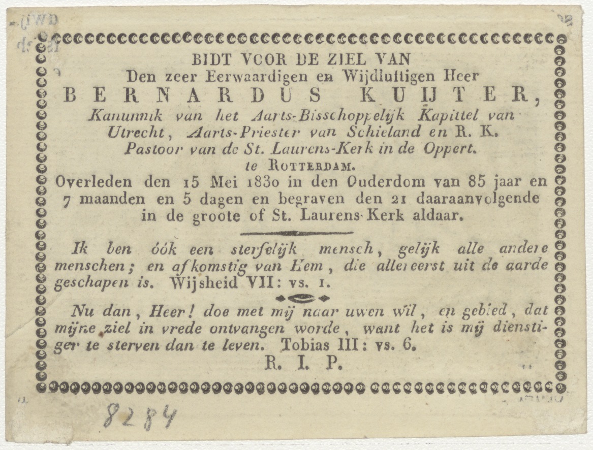 Absalom hangt aan de boom, kz. Religieus;bid voor ziel Bernardus Kuijter (+1830) pastoor St. Laurens de Oppert, Rotterdam