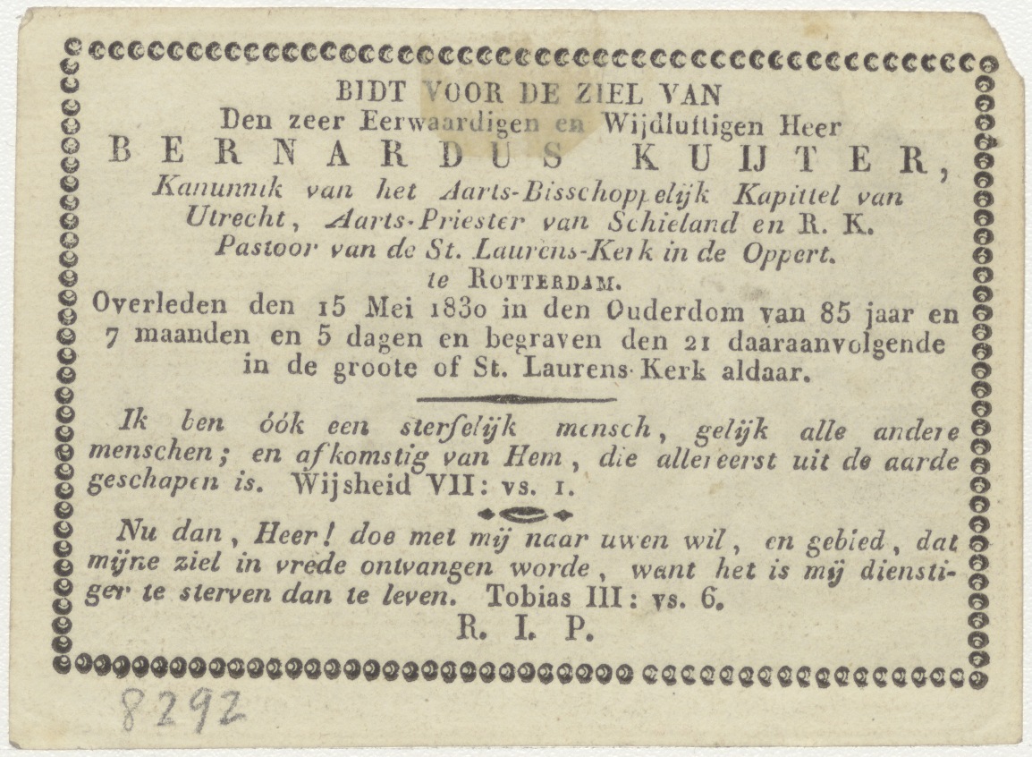 Maria, Regina Angelorum, kz. Religieus; bid voor ziel Bernardus Kuijter (+1830) pastoor St. Laurens de Oppert, Rotterdam