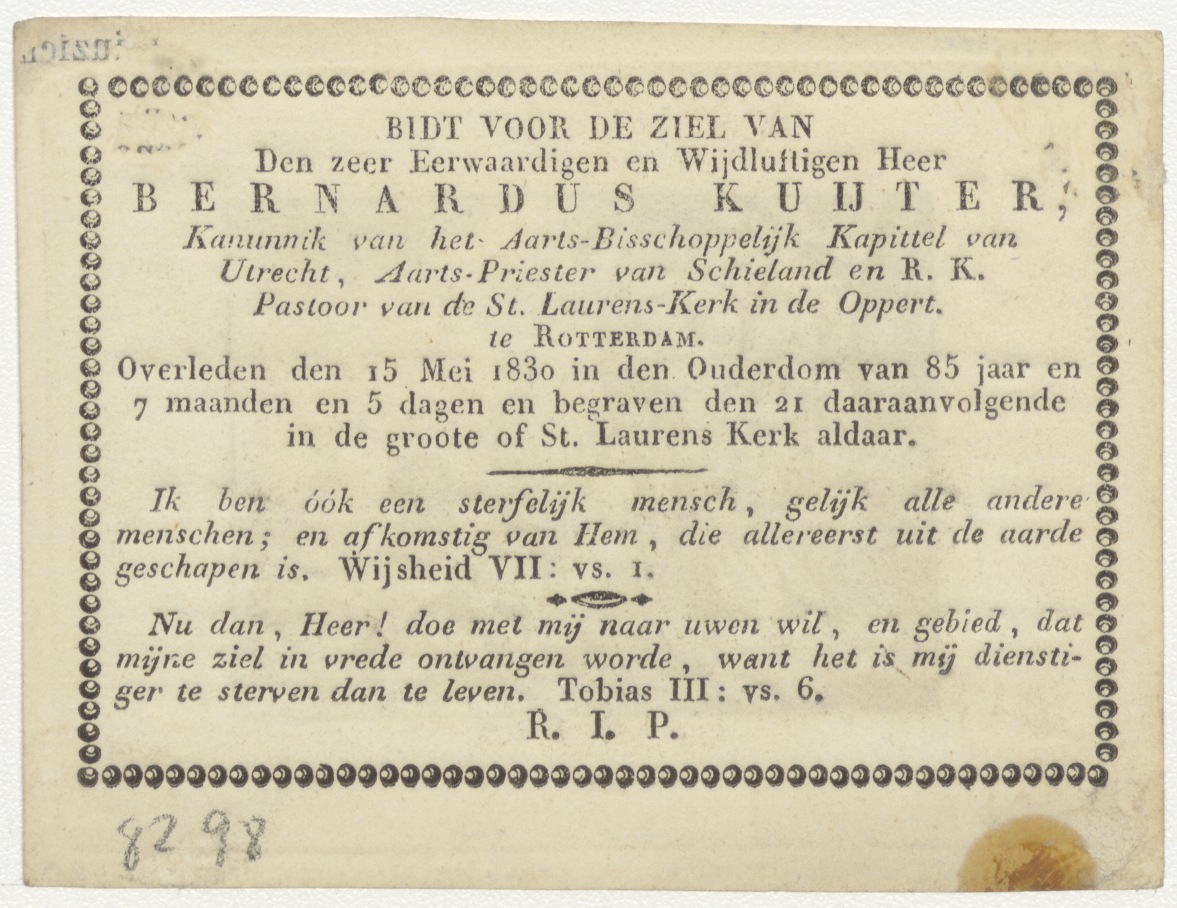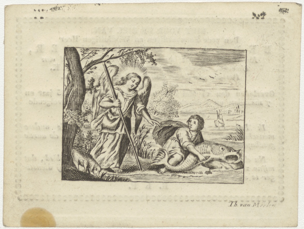 Tobias en de engel, kz. Religieus; bid voor ziel Bernardus Kuijter (+1830) pastoor St. Laurens de Oppert, Rotterdam