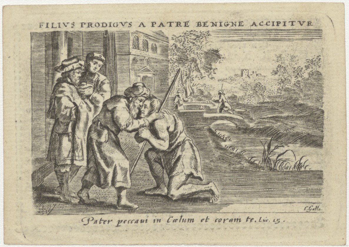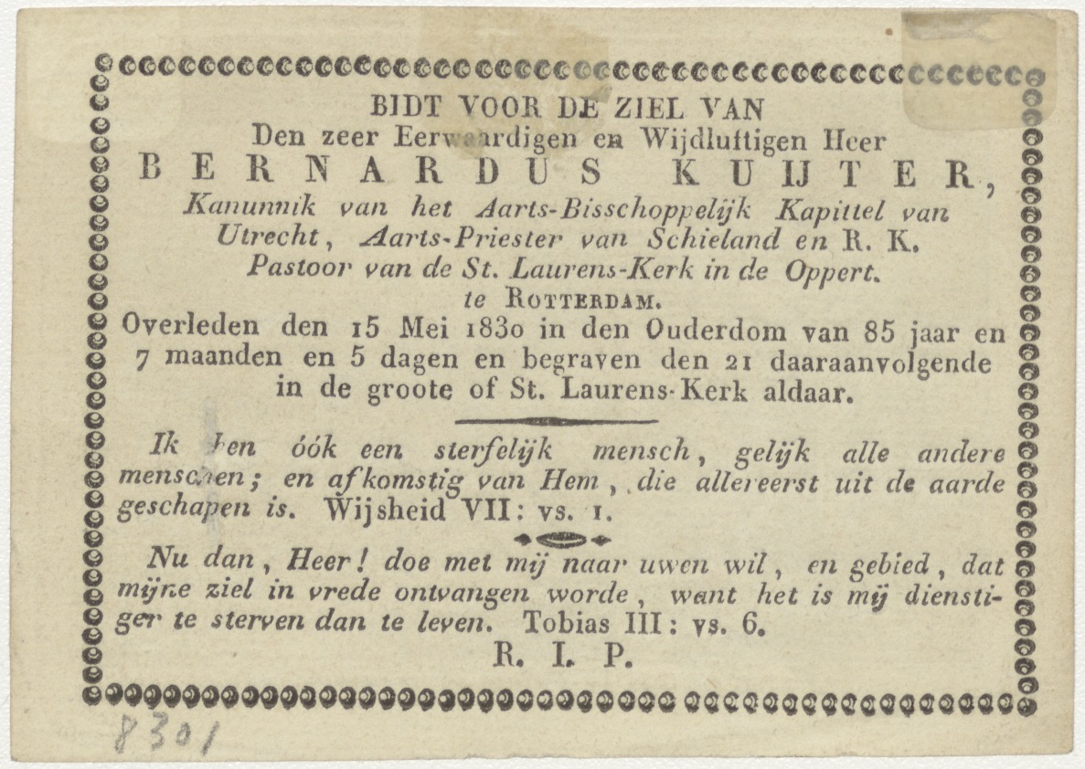 Terugkeer van verloren zoon, kz. Religieus; bid voor ziel Bernardus Kuijter (+1830) pastoor St. Laurens de Oppert, Rotterdam
