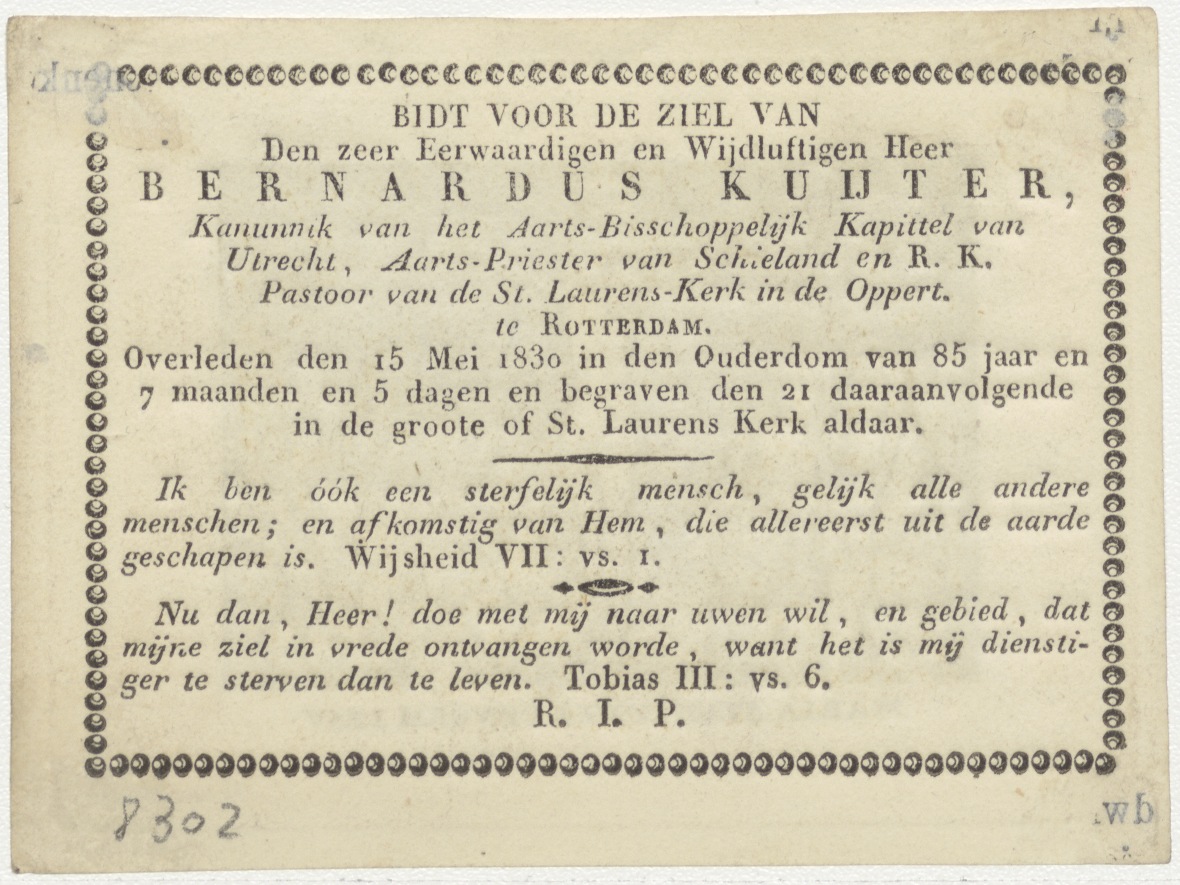 Gekruisigde Christus met Maria, Johannes en Maria Magdalena, kz. Religieus; bid voor ziel Bernardus Kuijter (+1830) pastoor St. Laurens de Oppert, Rotterdam