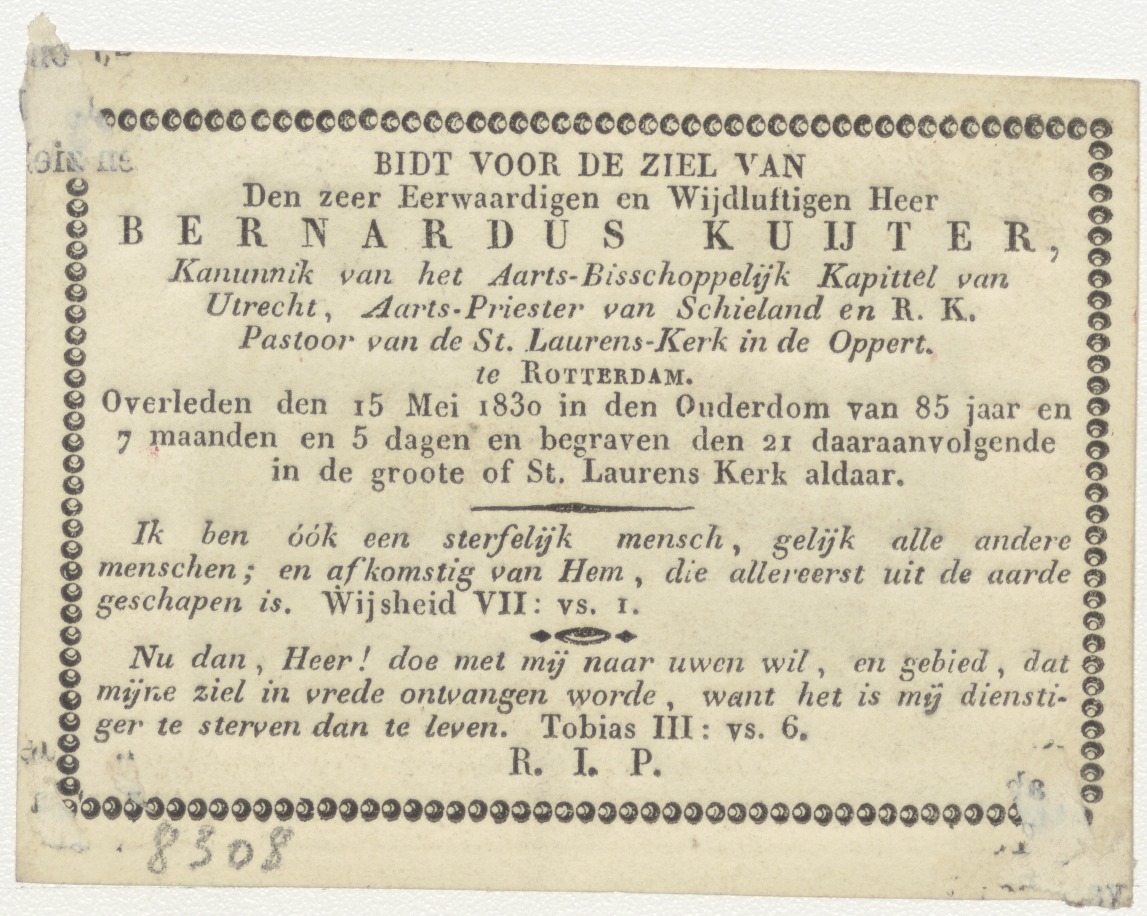 Maria met Christuskind, kz. Religieus; bid voor ziel Bernardus Kuijter (+1830) pastoor St. Laurens de Oppert, Rotterdam