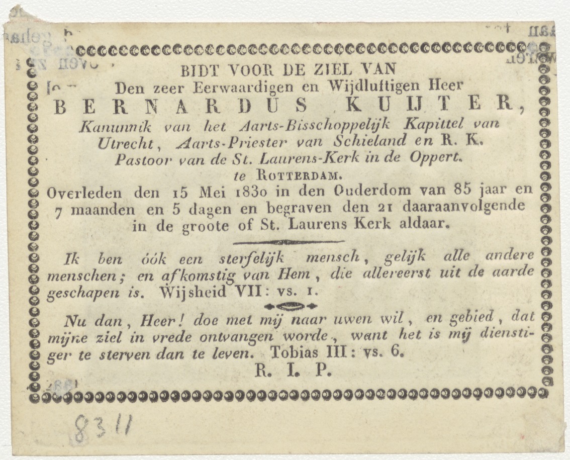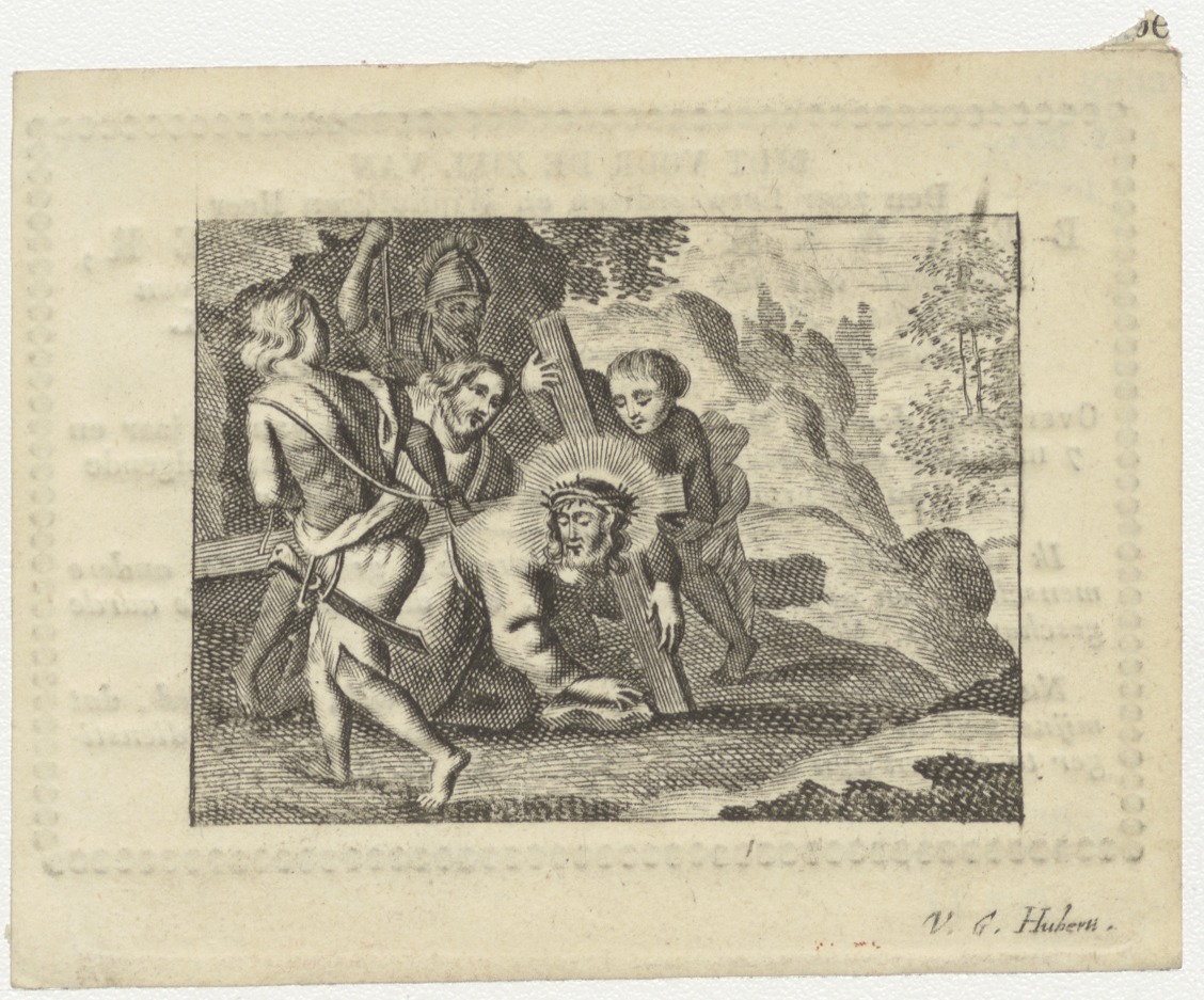 Christus valt met het kruis, kz. Religieus; bid voor ziel Bernardus Kuijter (+1830) pastoor St. Laurens de Oppert, Rotterdam