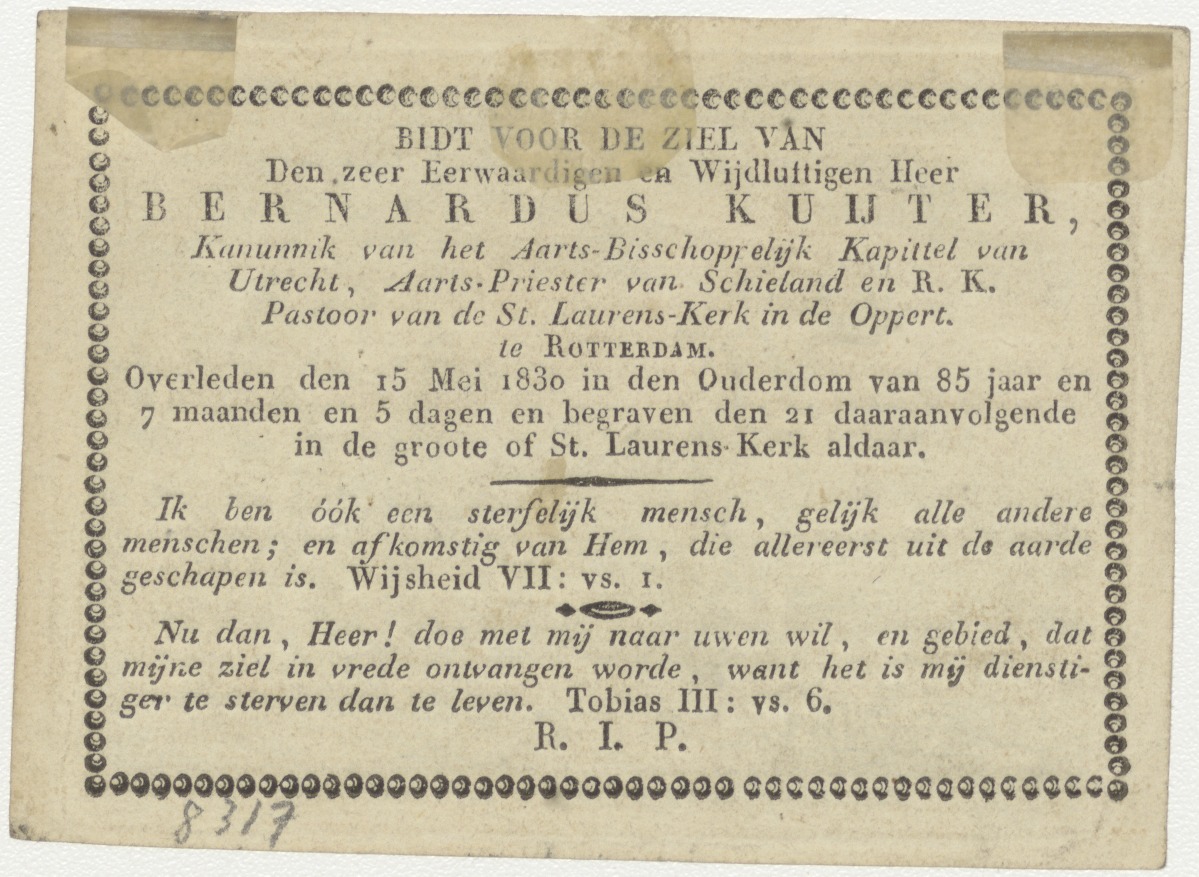 Christuskind met martelwerktuigen, kz. Religieus; bid voor ziel Bernardus Kuijter (+1830) pastoor St. Laurens de Oppert, Rotterdam