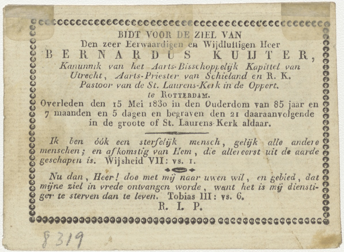 Amor divinus en Anima, kz. Religieus; bid voor ziel Bernardus Kuijter (+1830) pastoor St. Laurens de Oppert, Rotterdam