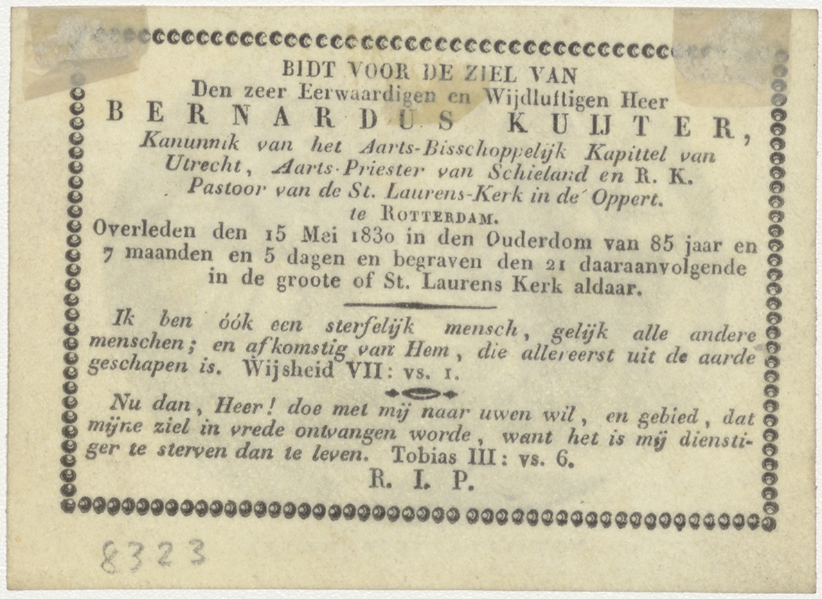 Geboorte van Christus, kz. Religieus; bid voor ziel Bernardus Kuijter (+1830) pastoor St. Laurens de Oppert, Rotterdam