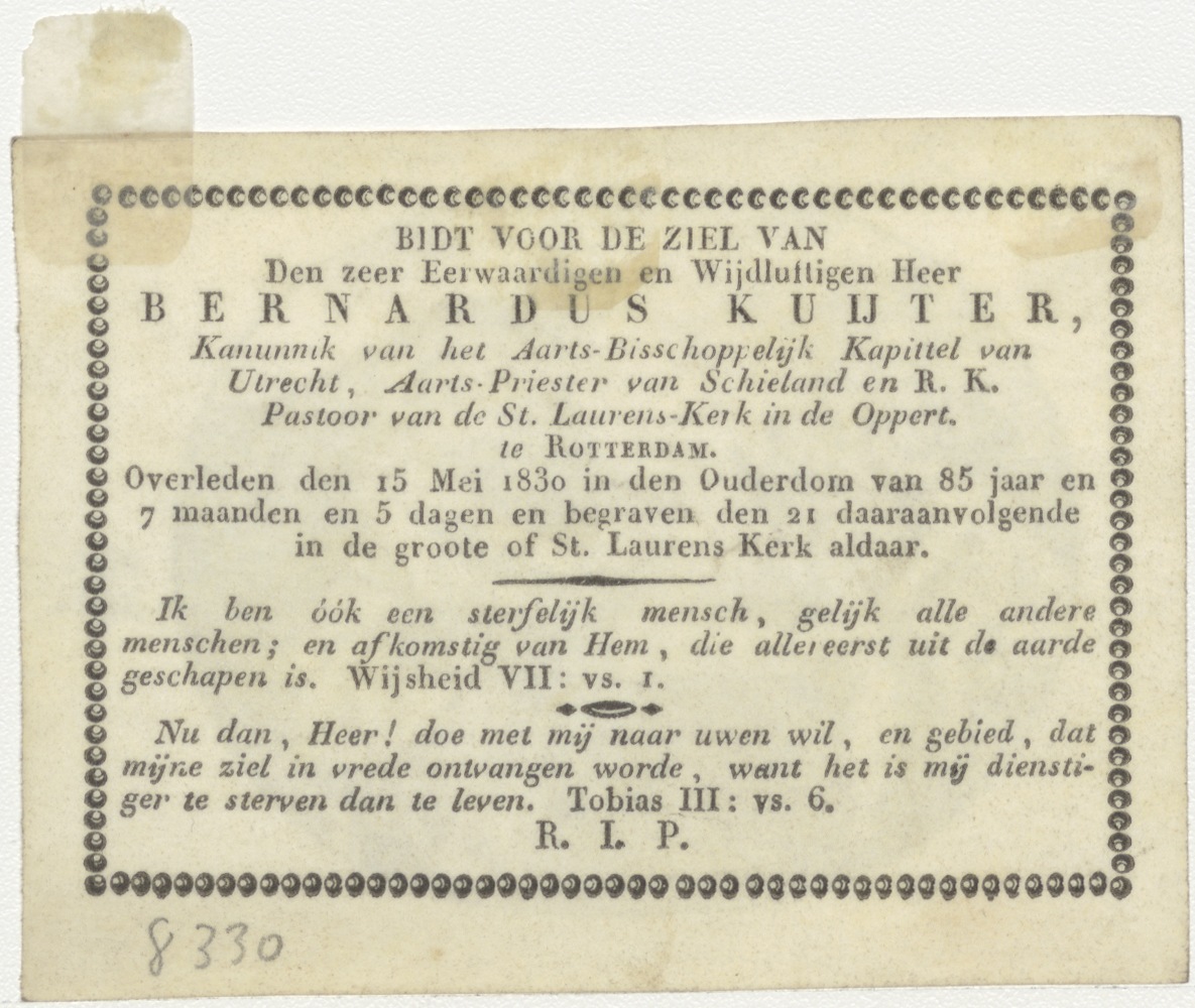 H. Familie, kz. Religieus; bid voor ziel Bernardus Kuijter (+1830) pastoor St. Laurens de Oppert, Rotterdam
