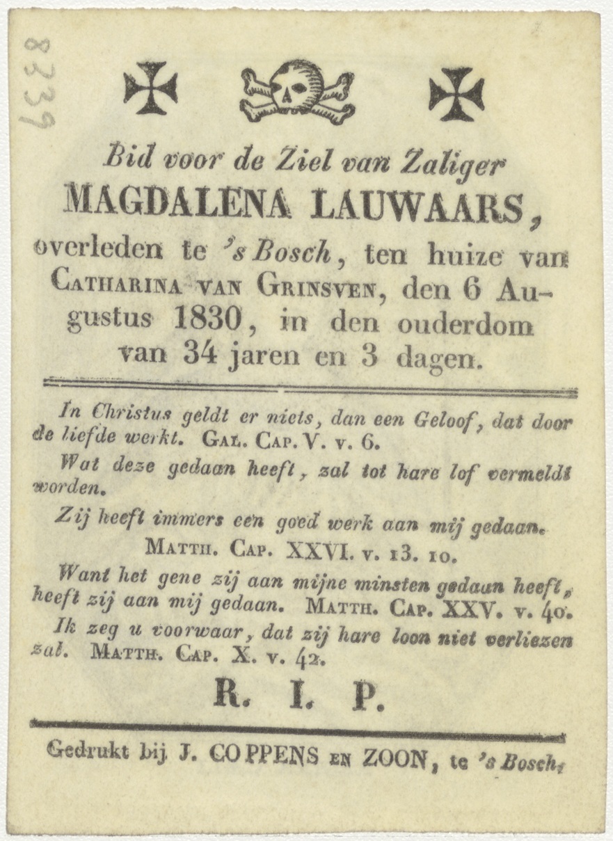Maria regina caeli, kz. Bid voor ziel Lauwaars-van Grinsven (+1830) Den Bosch