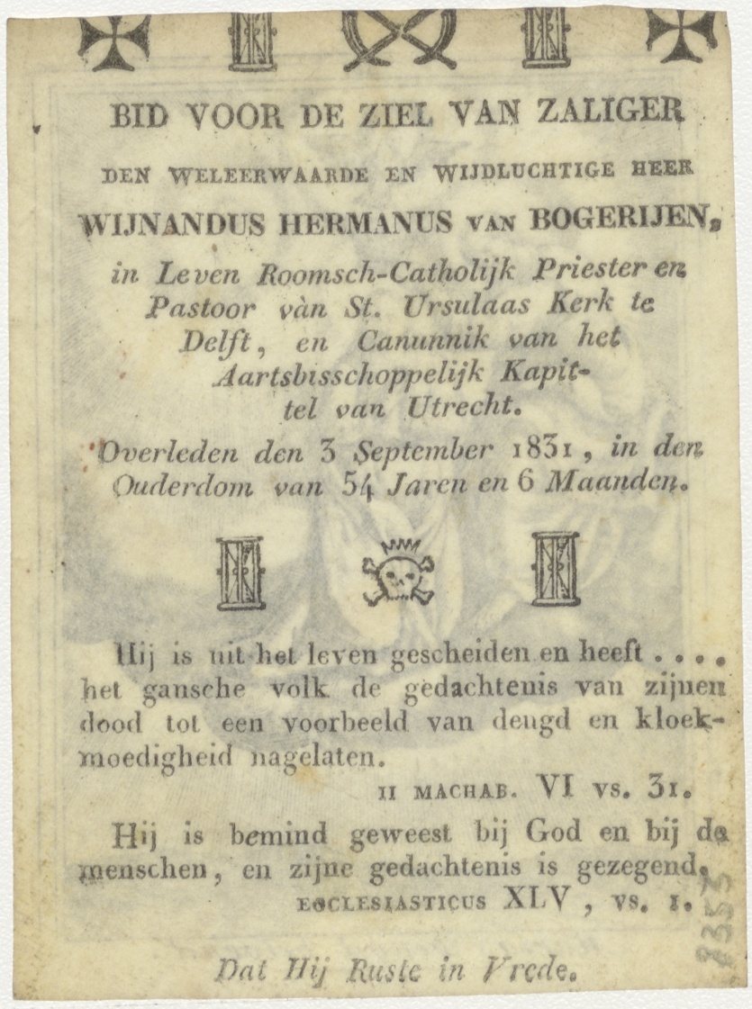 Het leven der Heilige Maagd Maria (serie): 20. Maria's deugd beloond, kz. Religieus; bid voor ziel Wijnandus Hermanus van Bogerijen (+1831) kanunnik Utrecht, pastoor H. Ursula Delft