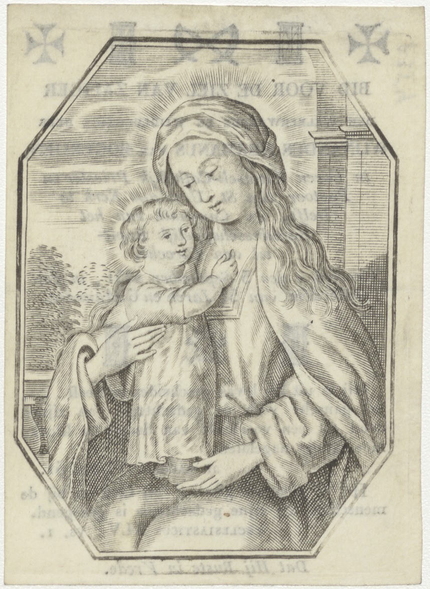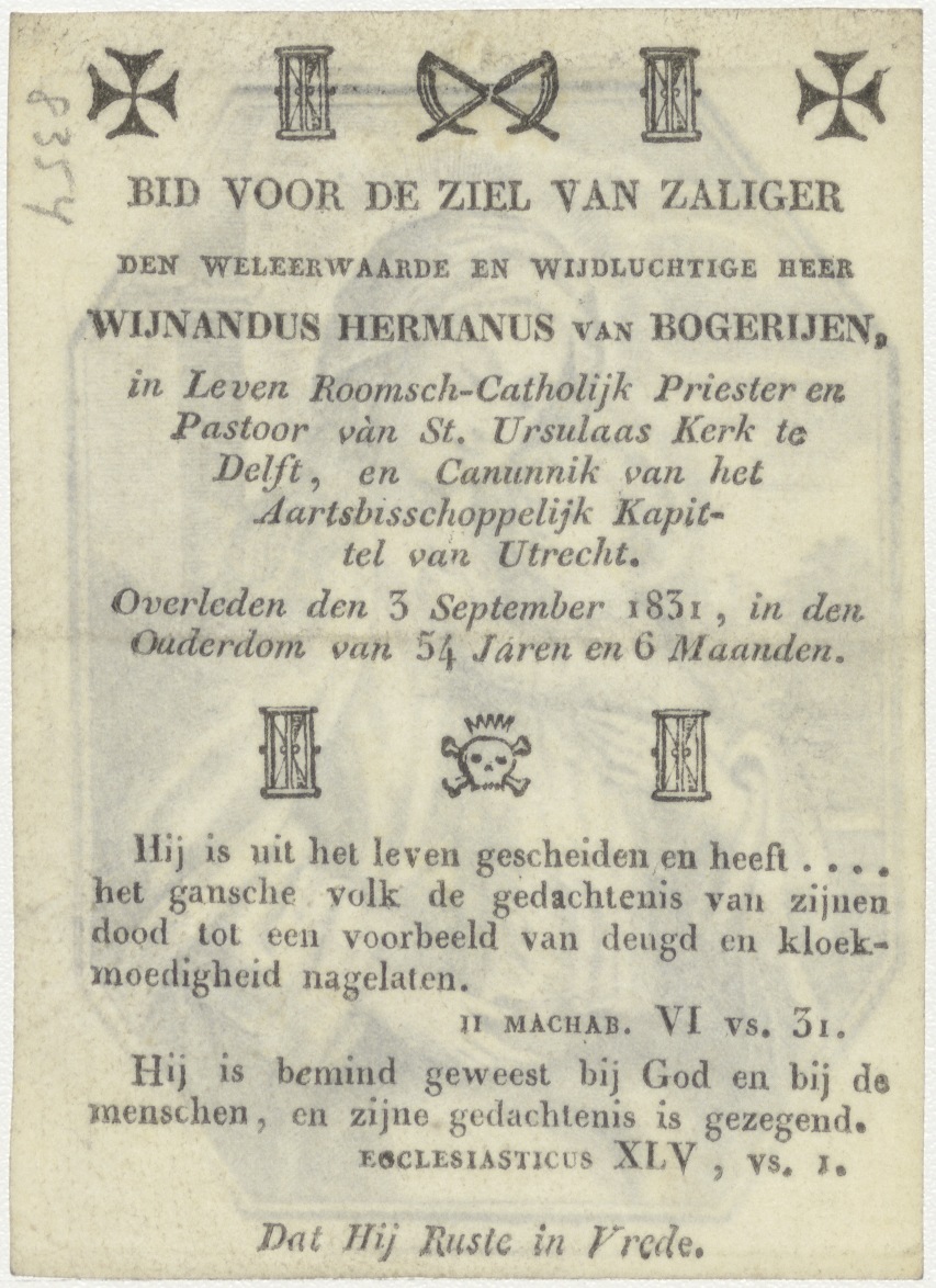 Maria met Christuskind, kz. Religieus; bid voor ziel Wijnandus van Bogerijen (+1831) kanunnik Utrecht, pastoor H. Ursula Delft