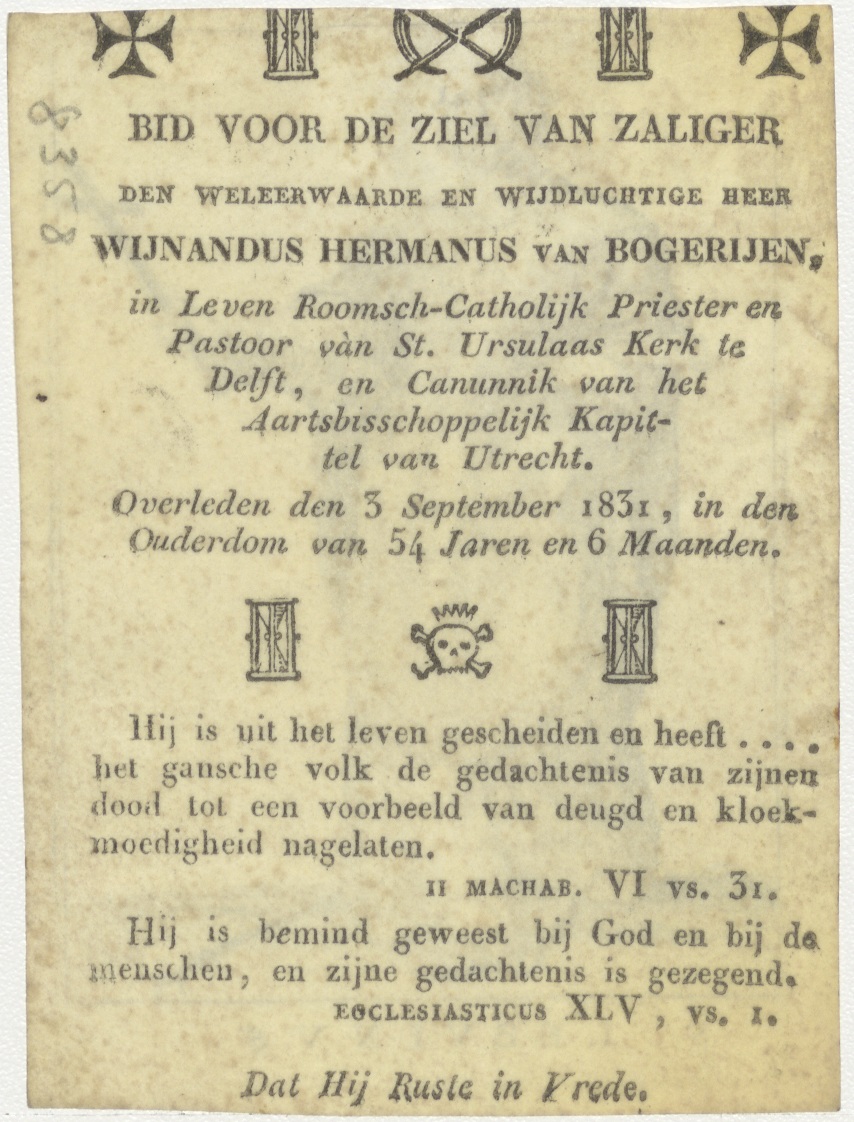 H. Lebiunus, kz. Religieus; bid voor ziel Wijnandus van Bogerijen (+1831) kanunnik Utrecht, pastoor H. Ursula Delft