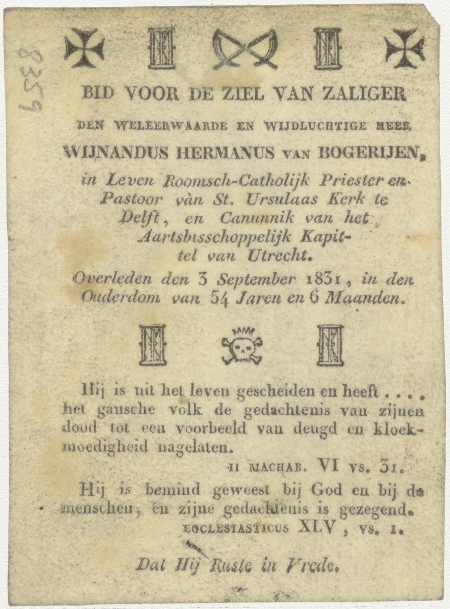 H. Engelmundus, kz. Religieus; bid voor ziel Wijnandus van Bogerijen (+1831) kanunnik Utrecht, pastoor H. Ursula Delft